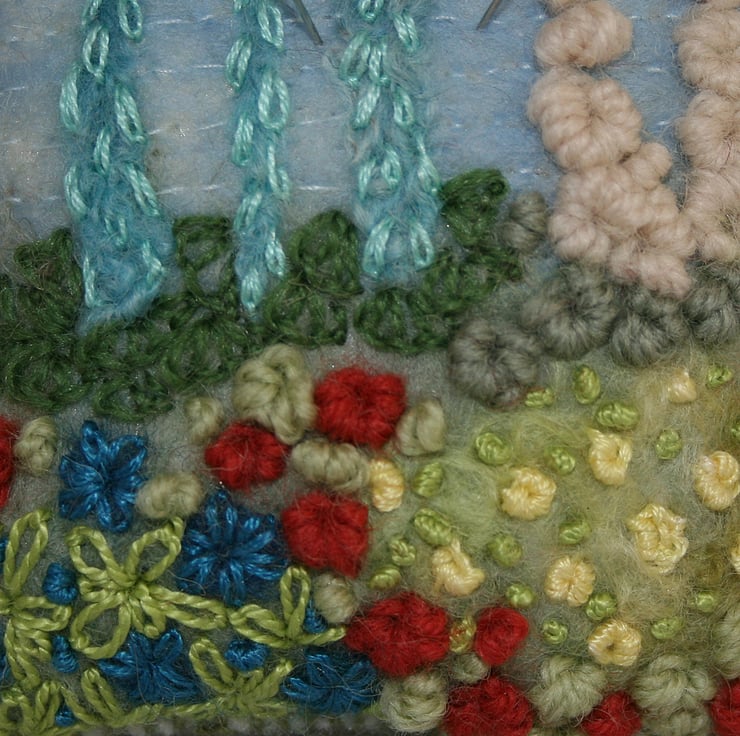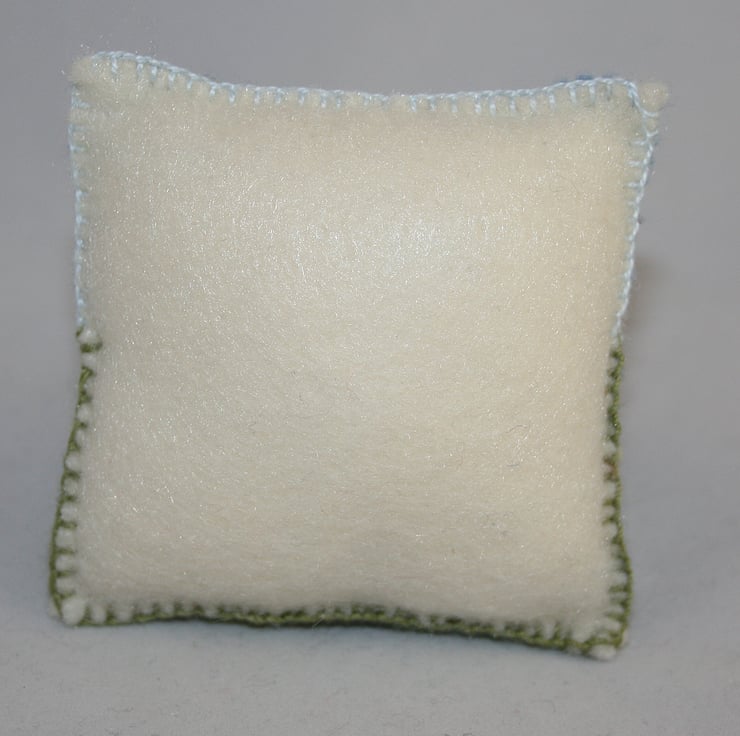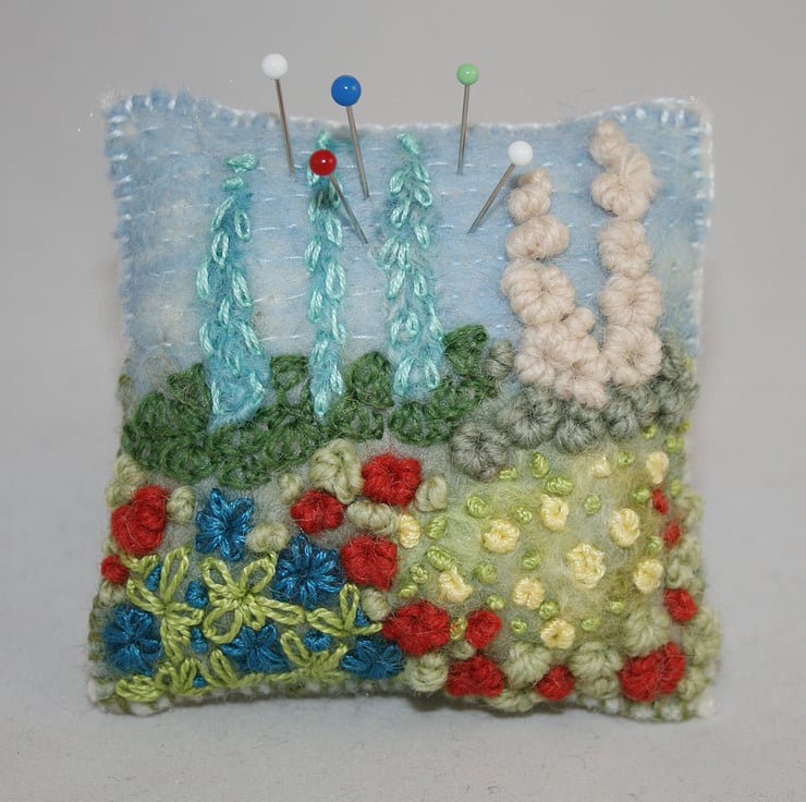 Sky blue wool fibers have been felted to a background of kunin felt (produced from recycled plastic bottles. Textured, hand-dyed wool tops, some of them with lovely curls, have been felted in clumps to represent the planting. Stitching in fine cotton has been added to the sky to 'stabilise' the felting. Simple embroidery stitches, in crewel, tapestry and knitting wools, have been used to create more foliage and the pretty flowers. The pincushion is edged in blanket stitch using threads to match the areas of the design.