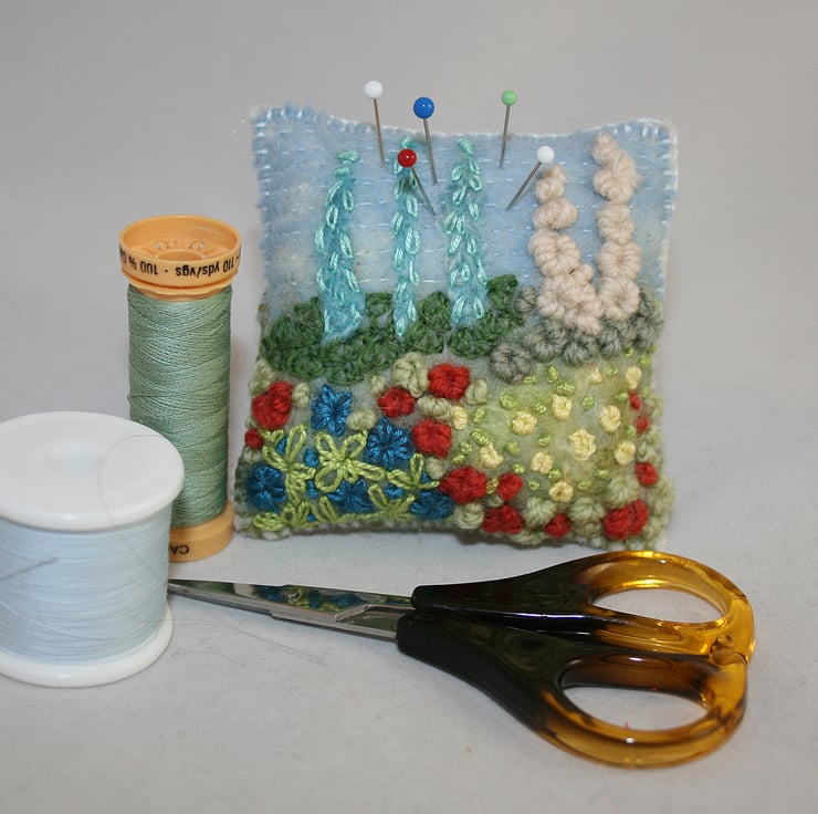 A pretty, felted and embroidered cottage garden border decorates this pincushion.