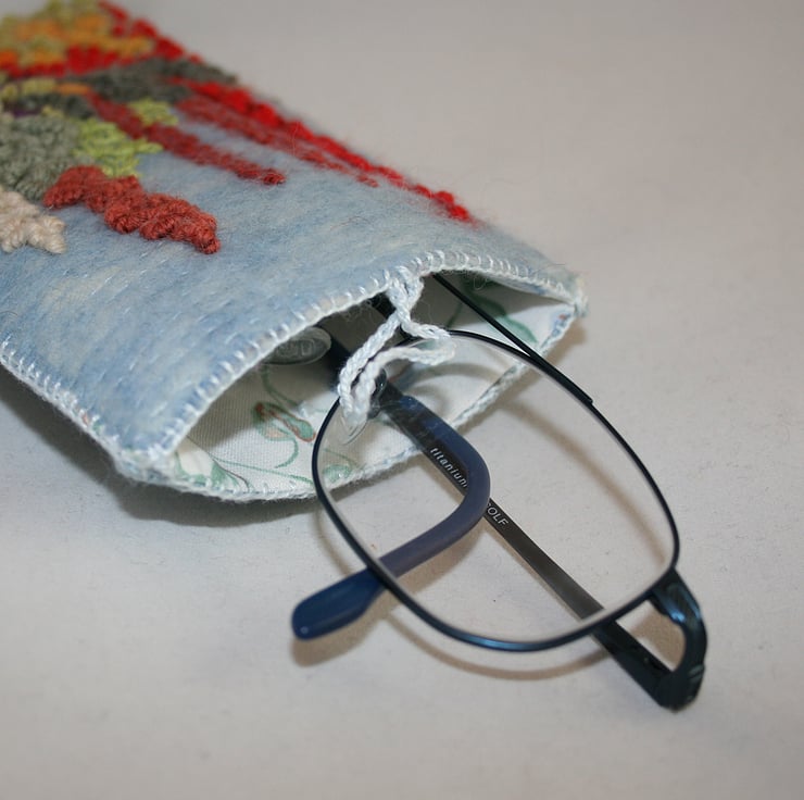 Sky blue wool fibers have been felted to a background of kunin felt (produced from recycled plastic bottles). Textured, hand-dyed wool tops, some of them with lovely curls, have been felted in clumps to represent the planting. Stitching in fine cotton has been added to the sky to 'stabilise' the felting. Simple embroidery stitches, in crewel, tapestry and knitting wools, have been used to create more foliage and the pretty flowers. The case is edged in blanket stitch using threads to match the areas of the design.