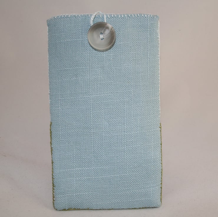 The case is lined in a printed cotton fabric - blue harebells on a white background, backed with iron-on interfacing. The reverse of the cover is a pale blue linen fabric. The case is seemed with blanket stitch in a pale blue crochet cotton for durability. The case closes with a crocheted loop - using the same blue cotton thread, over a grey button.