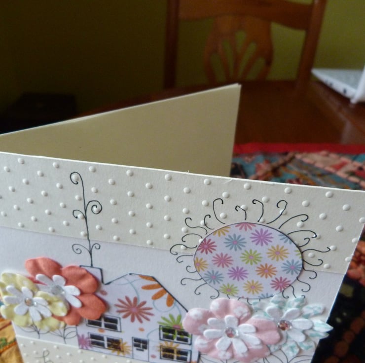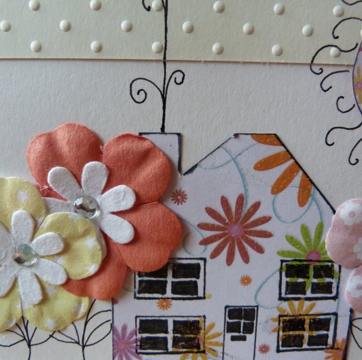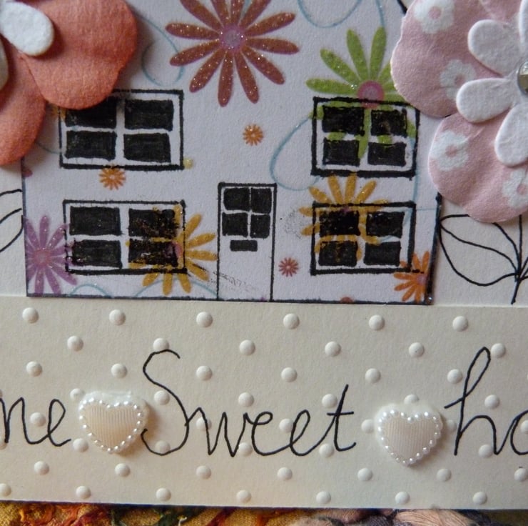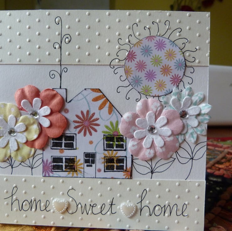 A so cute house hand cut from floral card mounted onto quality cream card. Enhanced with embossed dotty card at the top and bottom. Embellished with a sun hand cut from floral card, and a row of pastel coloured flowers with rhinestone centres. Pen and ink decorates the sun, house and leaves. Home sweet home hand written and decorated with two pearl plastic hearts.