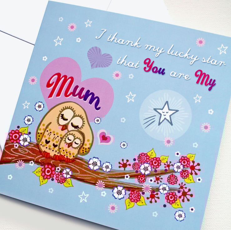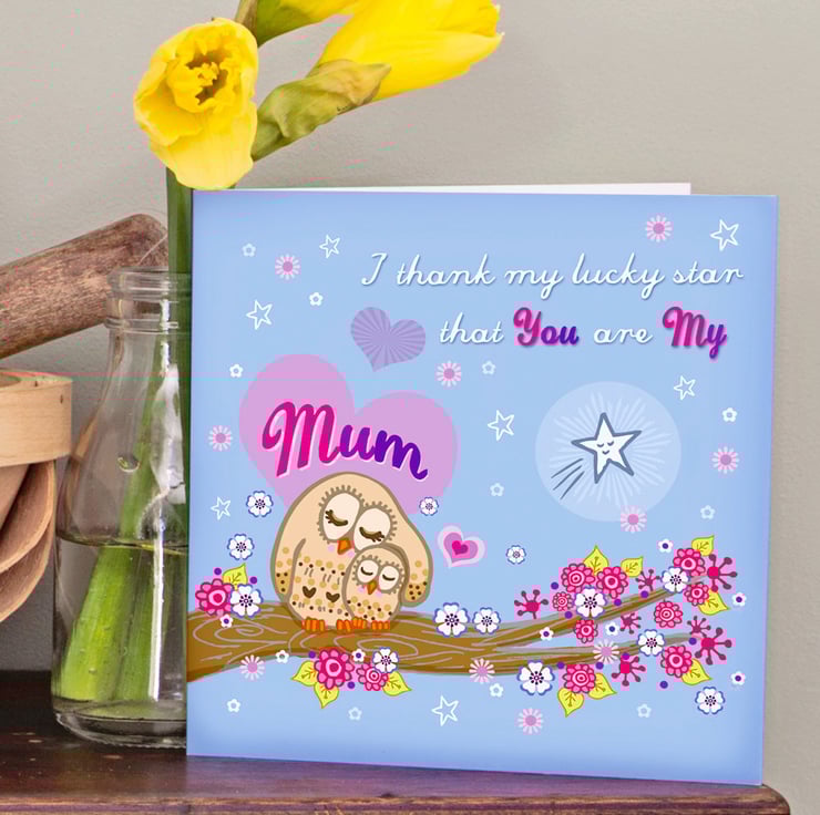 'Thank my Lucky Star' Mother's Day card. 15cm x15cm printed onto FSC, 280gsm card using very high quality digital colour printing with a silk finish ensuring the colours are vibrant. Blank inside for your own message, this card comes with a white diamond fold envelope and cello bag to protect it.
