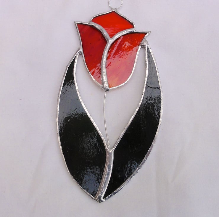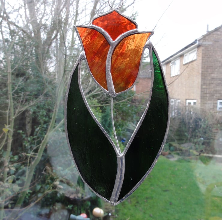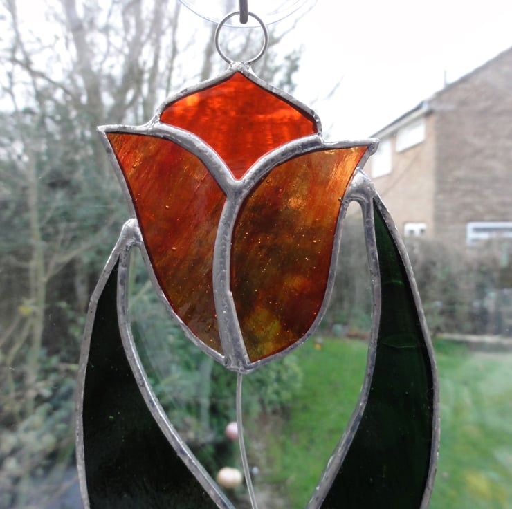 The glass used for this tulip is red streaky glass which looks orangey and orange water glass and the leaves from two green streaky glass, the stem is made from wire.