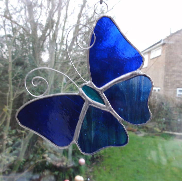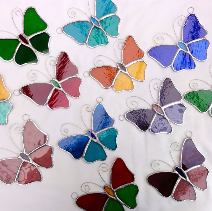 The butterfly measures 12 cms across by 9 cms excluding antenna. This would be lovely hanging in any window or even on a mirror, and they look especially good if hung in pairs or more. Did you know the collective noun for a group of butterflies is a kaleidoscope?