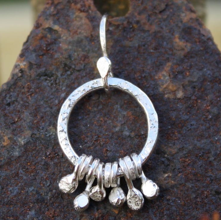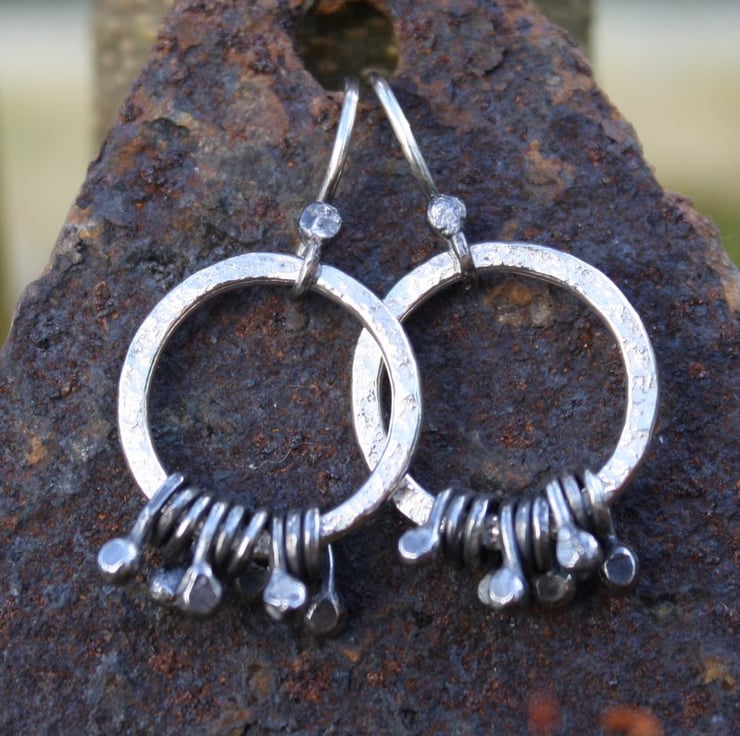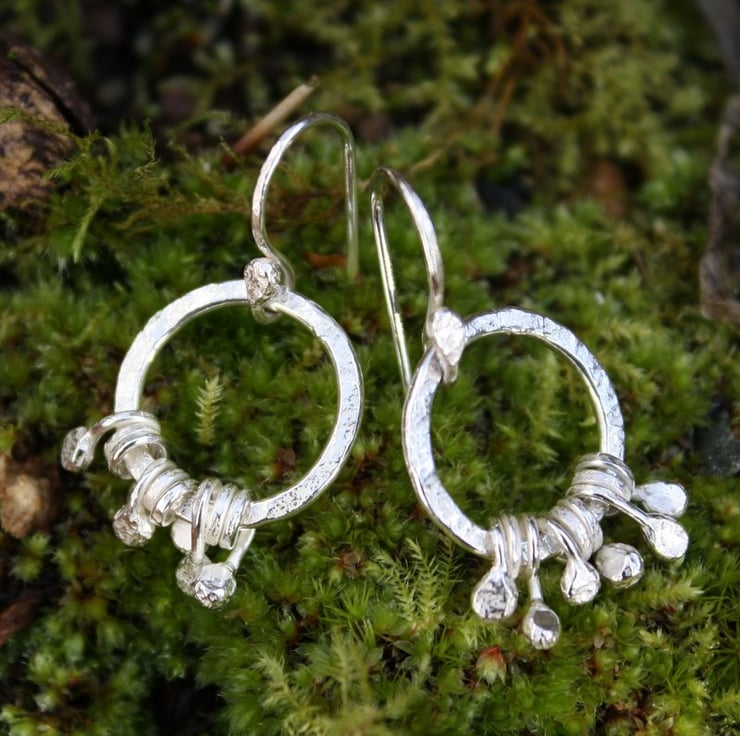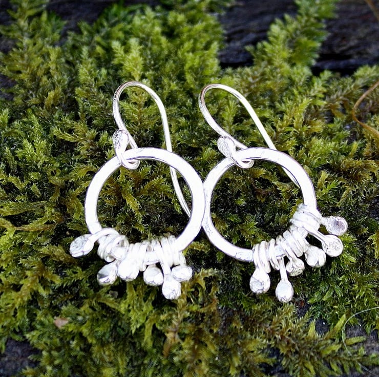 Small rings of textured silver with a fringe of handmade silver "spore" beads., hang from handmade ear hooks.