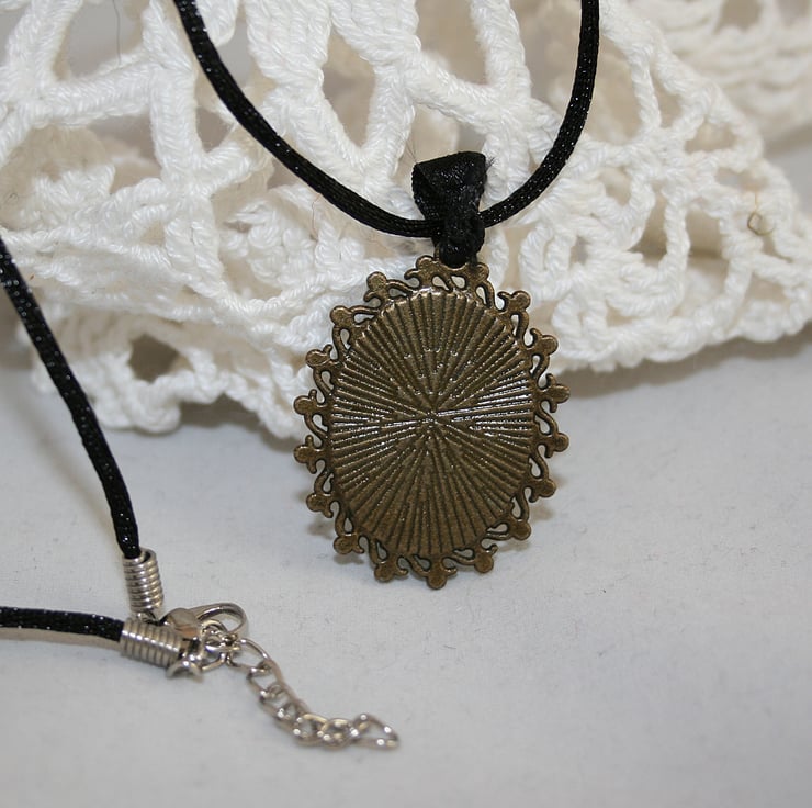 The panel has been glued to a pendant mounting in an antique gold tone metal. A ribbon bail has been stitched and the pendant is suspended from a cord, fastening with a lobster claw clasp into a length of chain by which the pendant length may be adjusted.