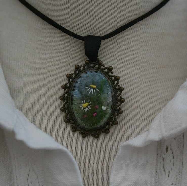 A tiny felted and embroidered meadow, with daisies and clover, framed in a pendant mounting.
