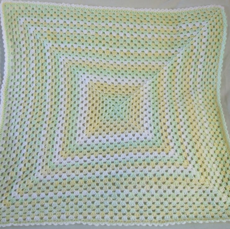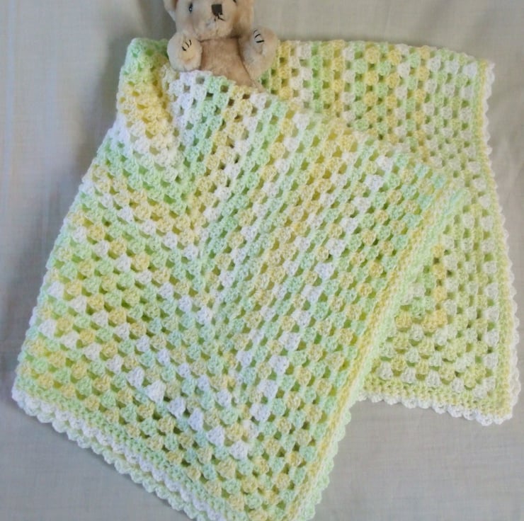 Traditional crochet 'Granny Square' baby blanket in a soft acrylic baby yarn