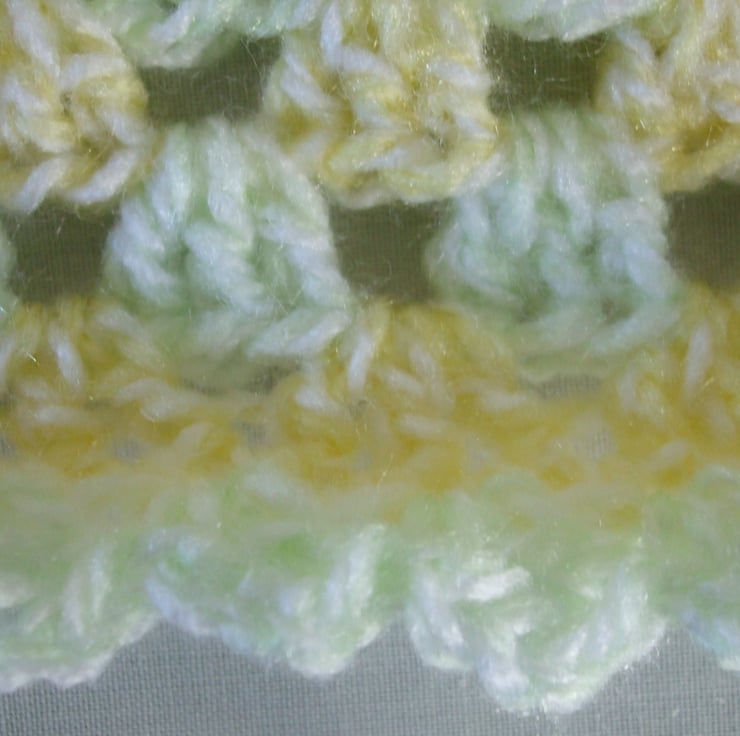 Yarn is green, lemon and white forming subtle random stripes as it is used