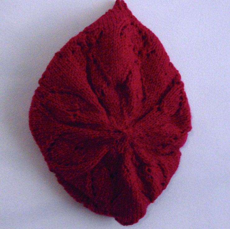This beautiful beret is hand knitted from lovely soft dark pink yarn (100% acrylic). It is knitted with a fancy pattern which adds extra design to this smart hat.