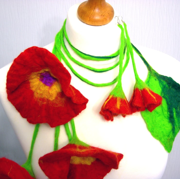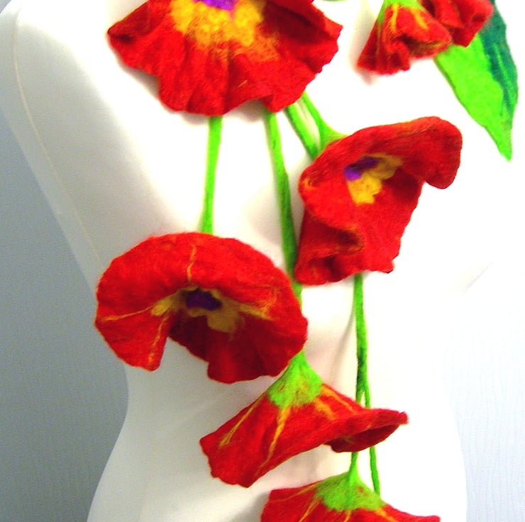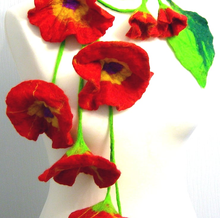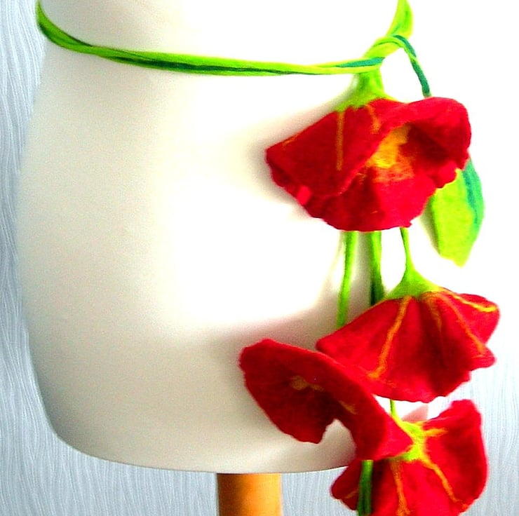 FELTED NECKLACE -scarf- belt ---100% WOOL- RED flowers -