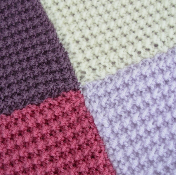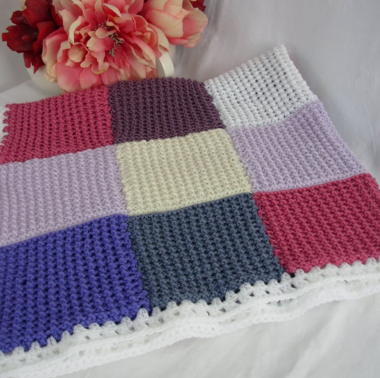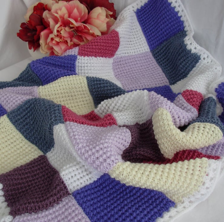 Hand knitted patchwork snuggle blanket - pink, lilac, grape, purple, blue, white and cream squares knitted in a rice stitch pattern and finished with a white crochet border. All in acrylic yarn - 30ins (76cm) by 30ins (76cm) - Cool wash recommended