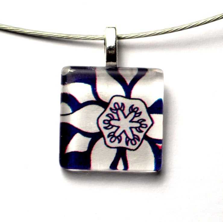 This distinctive glass pendant is made from a small glass tile backed with a blue and white kimono pattern and hand sealed.