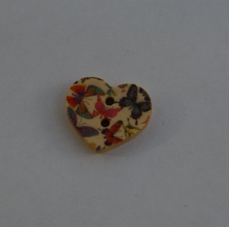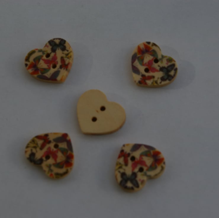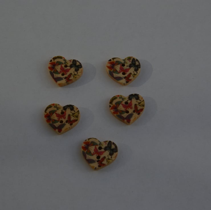 Five pretty wooden buttons in the shape of little hearts. Each one is printed with colourful butterflies and has two sewing holes. They are sure to brighten up any craft project.