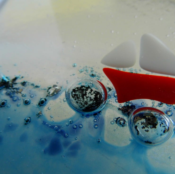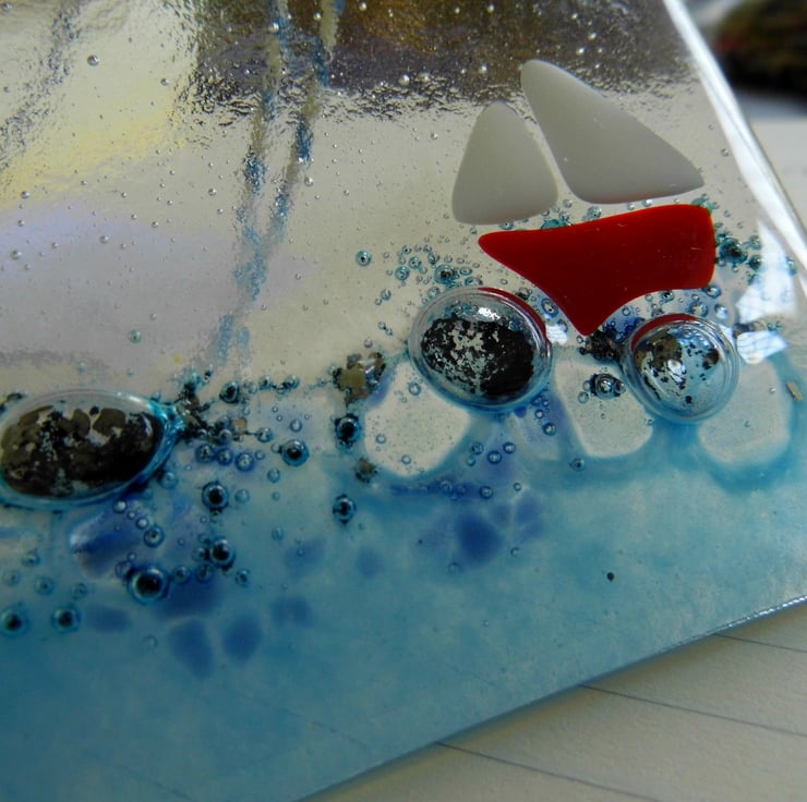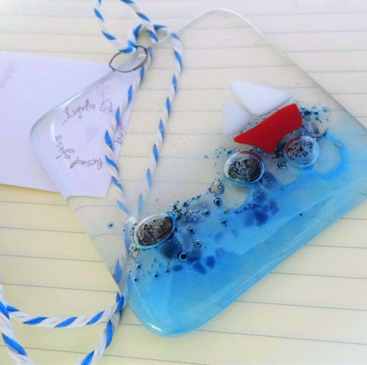 this is a fused glass hanger made from layers of glass and featuring a bobbly boat on a bubbly sea,