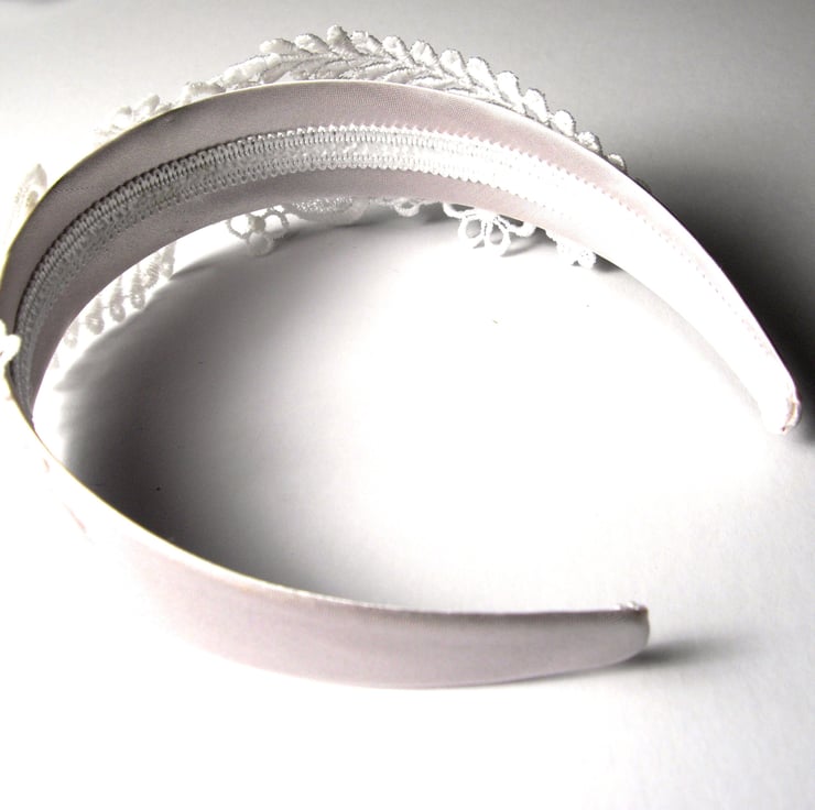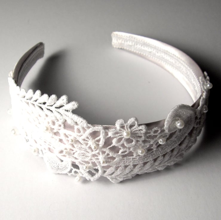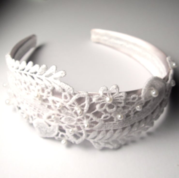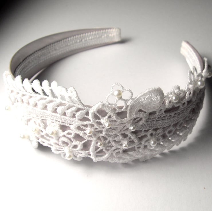 This beautiful head band is handmade made from white stiffened lace enhanced with individually hand sewn pearl beads all hand sewn onto a satin covered head band.
