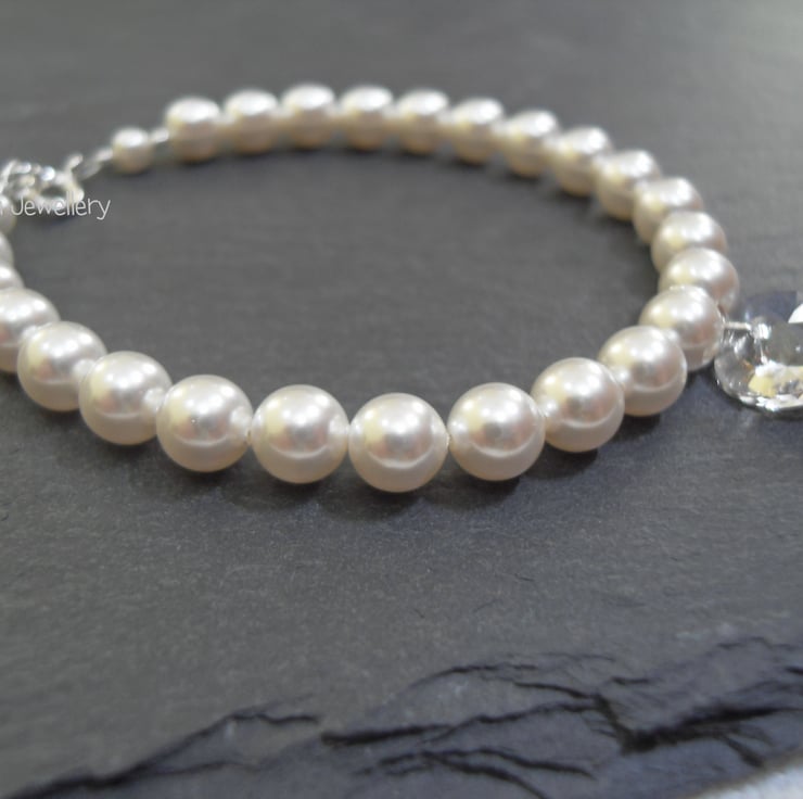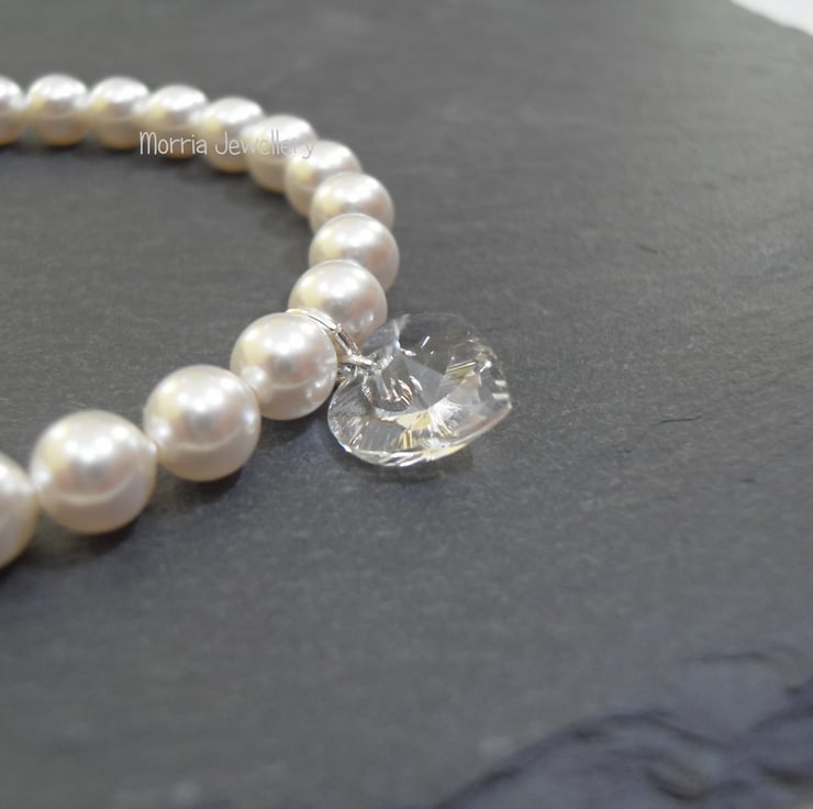 A simple high end crystal pearl bracelet with a high end crystal heart charm.