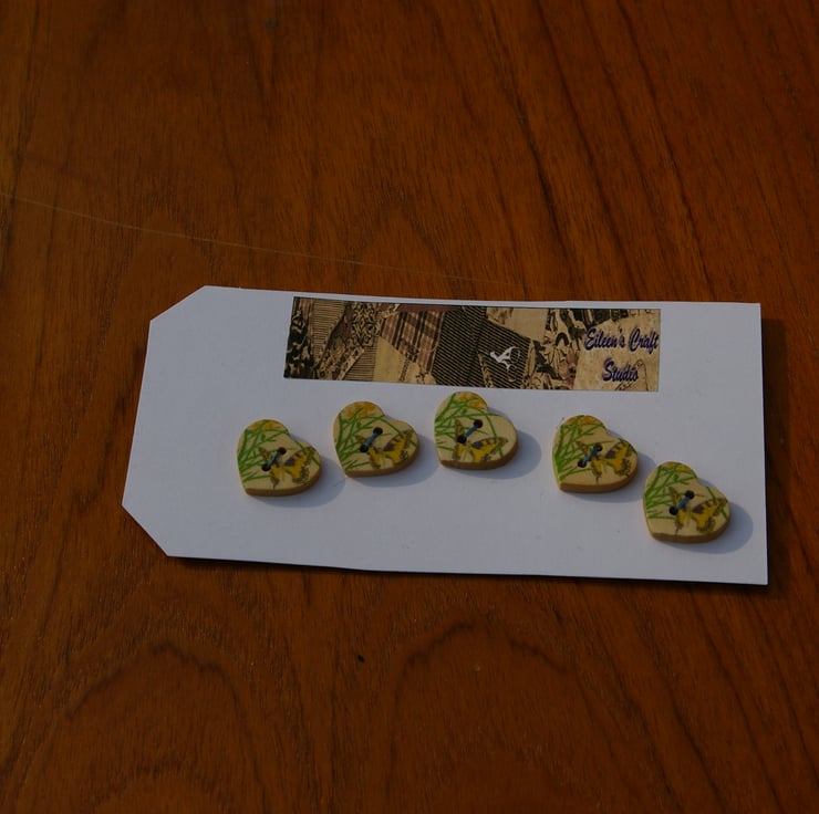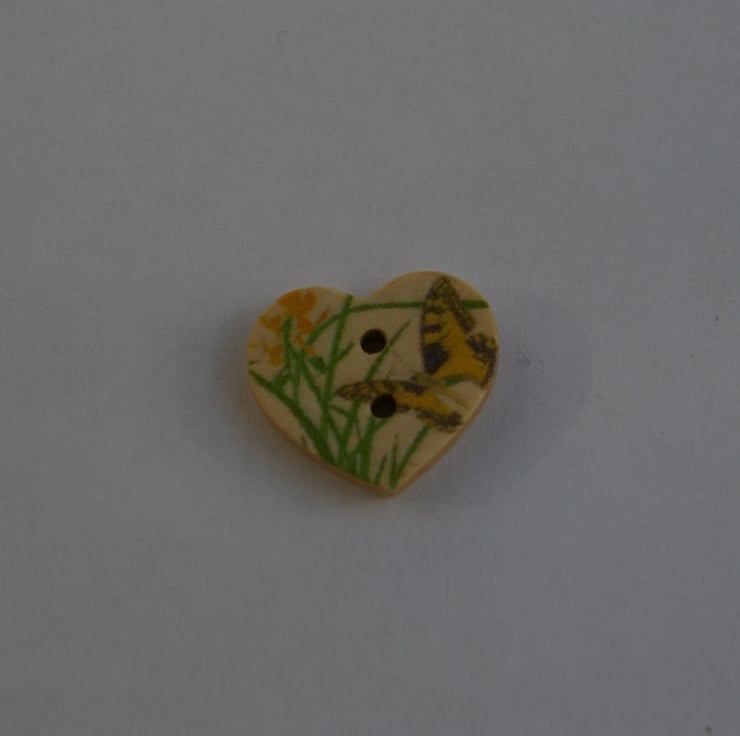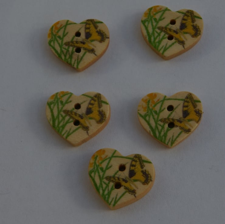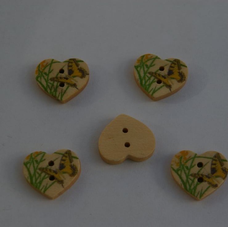 Five pretty wooden buttons in the shape of little hearts. Each one is printed with a little butterfly and has two sewing holes. They are sure to brighten up any craft project.
