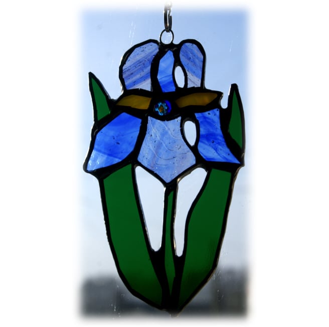 The suncatcher hangs from a chain which is securely attached to the top of the iris which is 13 cm high and 8cm wide.