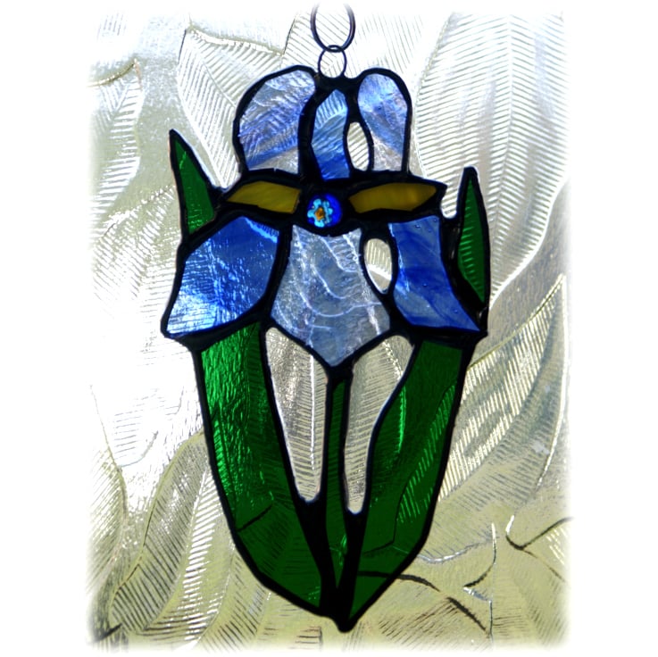 It is a simple floral design, of a beautiful blue flower, an iris. I've used lots of very streaky glass to make it extra pretty. Its strappy leaves are bright green and it has a pretty floral bead at the centre of the flower enhanced with some pieces of golden yellow iridescent glass.