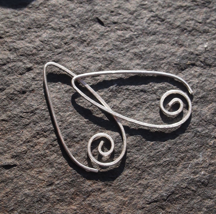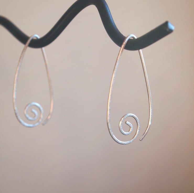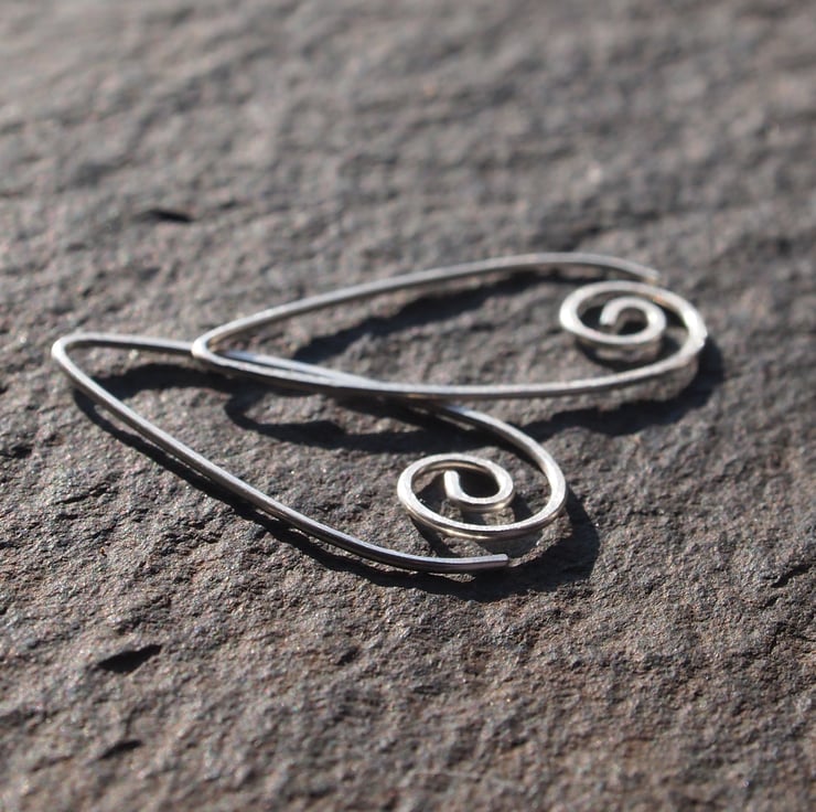 Simple, comfortable and modern - these handmade sterling silver earrings are formed in one piece. They have a curl of silver at the bottom and have been gently hammered to add texture.