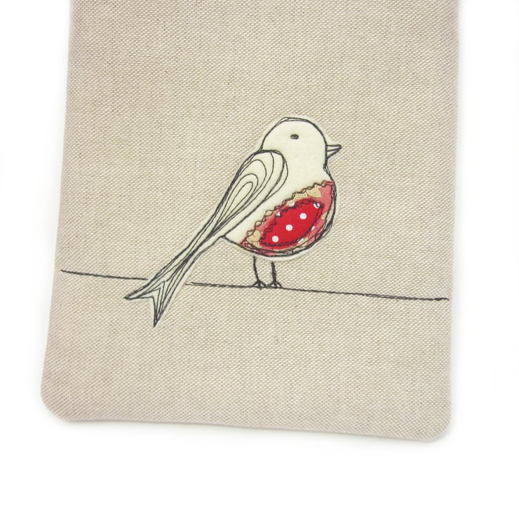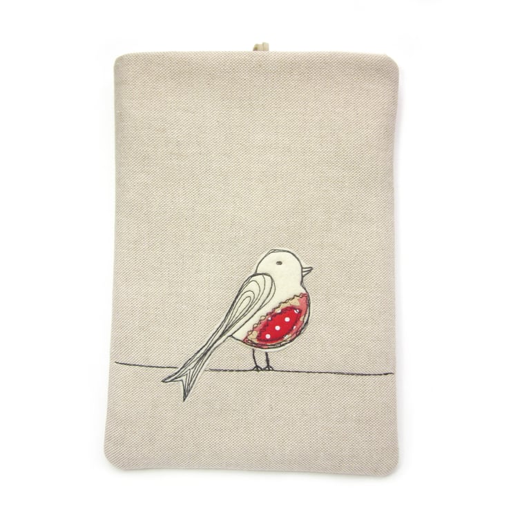A sweet fabric eReader case with a red bird applique on the front.