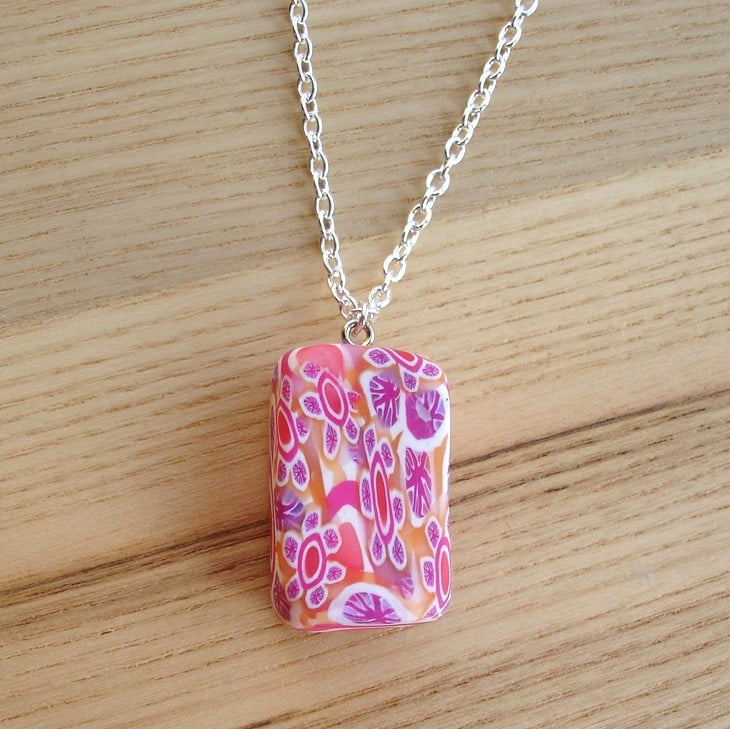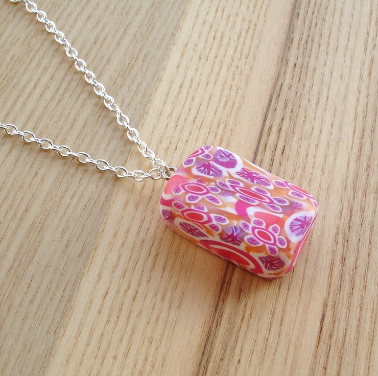 This lovely chunky fimo polymer clay pendant is handmade using my own millefiori canes, carefully finished with a silver plated bail. It hangs from an 16 long silver plated chain (long chain available on request). Fabulously cute and one of a kind!