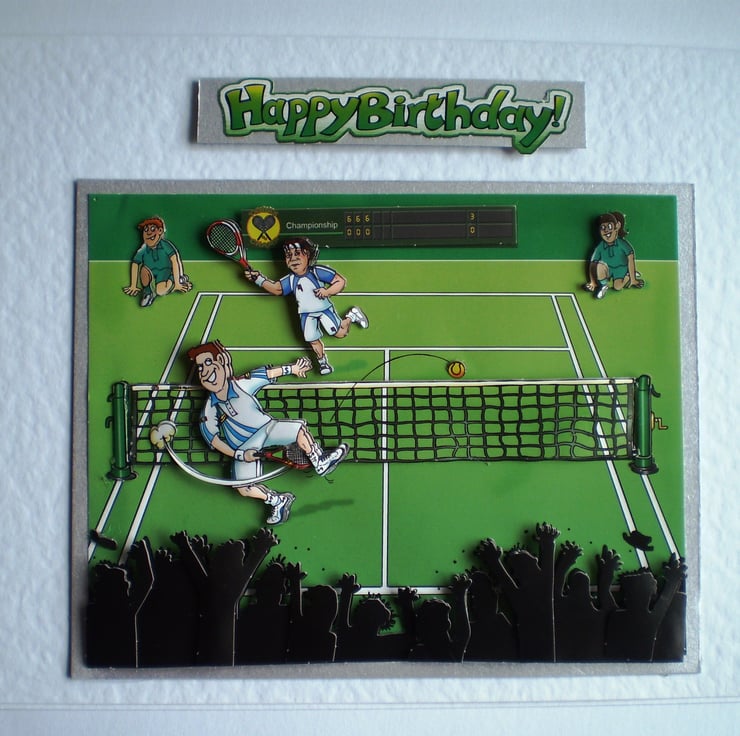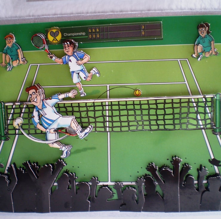 A white card measuring150x210mm(6x8in) features male tennis players mounted on a solver background. Insert is blue with a few words. I also do a ladies tennis player card. This is a decoupage 3Deffect card