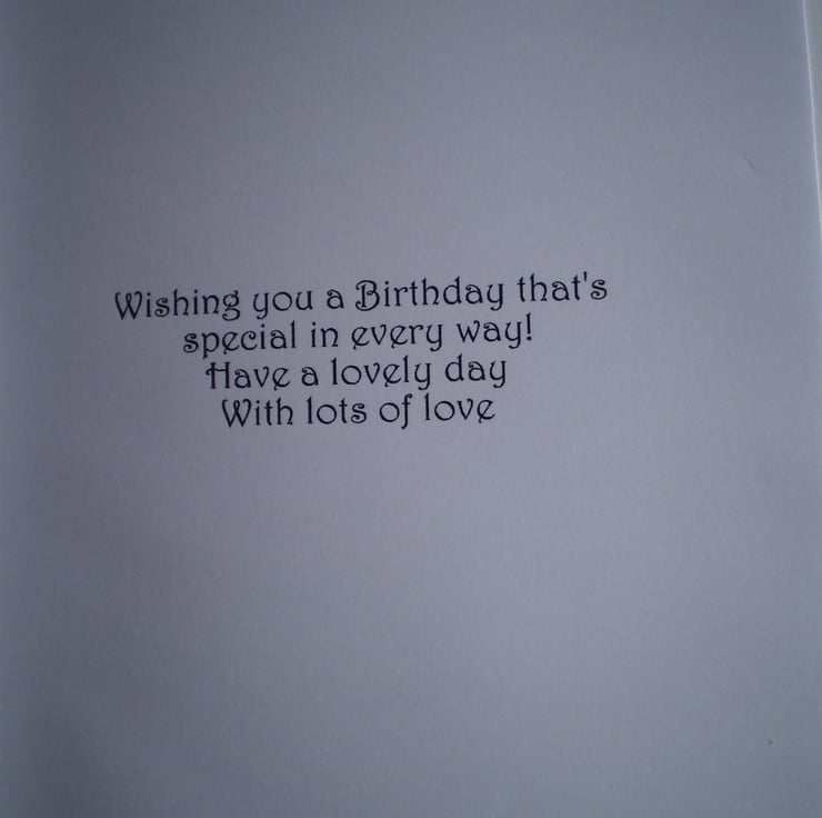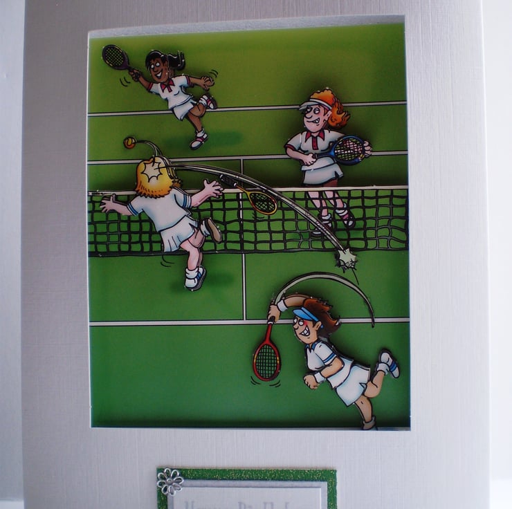 A white card measuring 150x203mm( 6x8in) with an oblong aperture features female tennis players .Insert is white with a few words. I also do a male tennis player card. This is a decoupage 3Deffect card