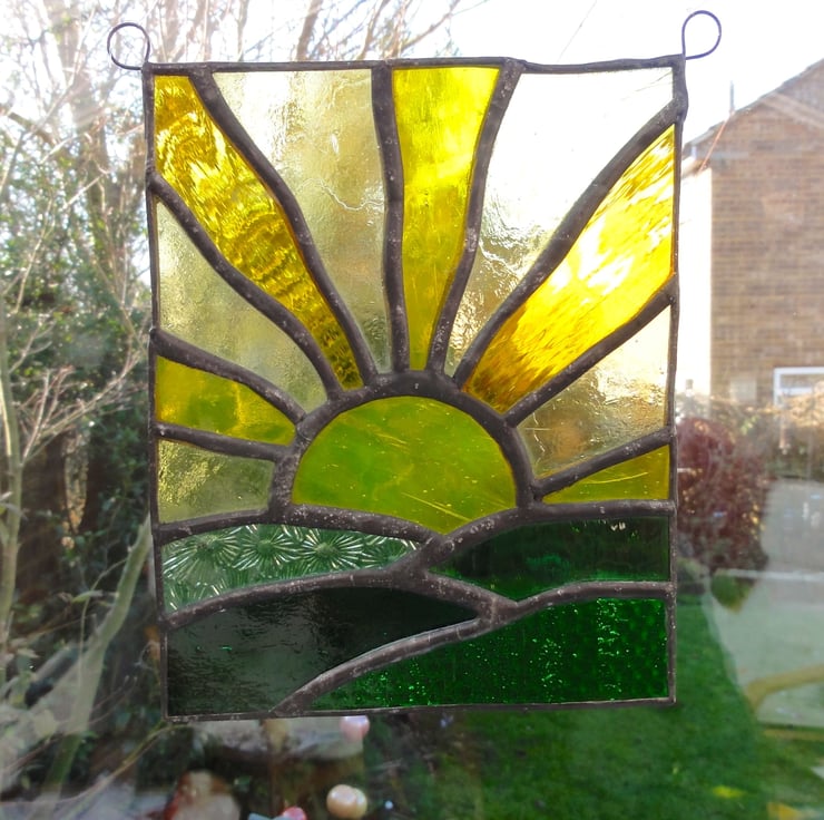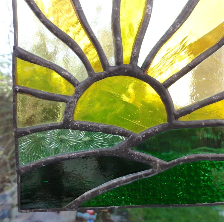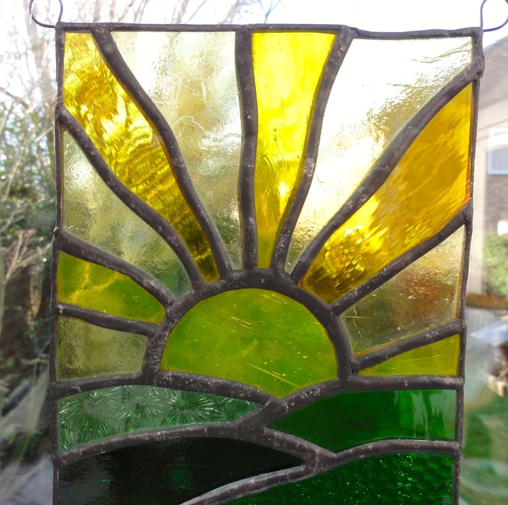 The glass used for this panel is three types of yellow glass - pale yellow restoration glass, yellow water glass and yellow restoration glass for the sun and pale green florentine, green water glass, dark green restoration glass and Christmas green hammered glass. Each piece of glass has been copper foiled and soldered together with a patina applied to blacken the solder. Rings and a length of fishing line have been attached for hanging purposes.