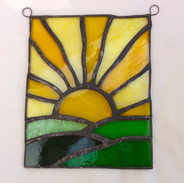 Here is a pretty stained glass panel showing the sunrise over fields.