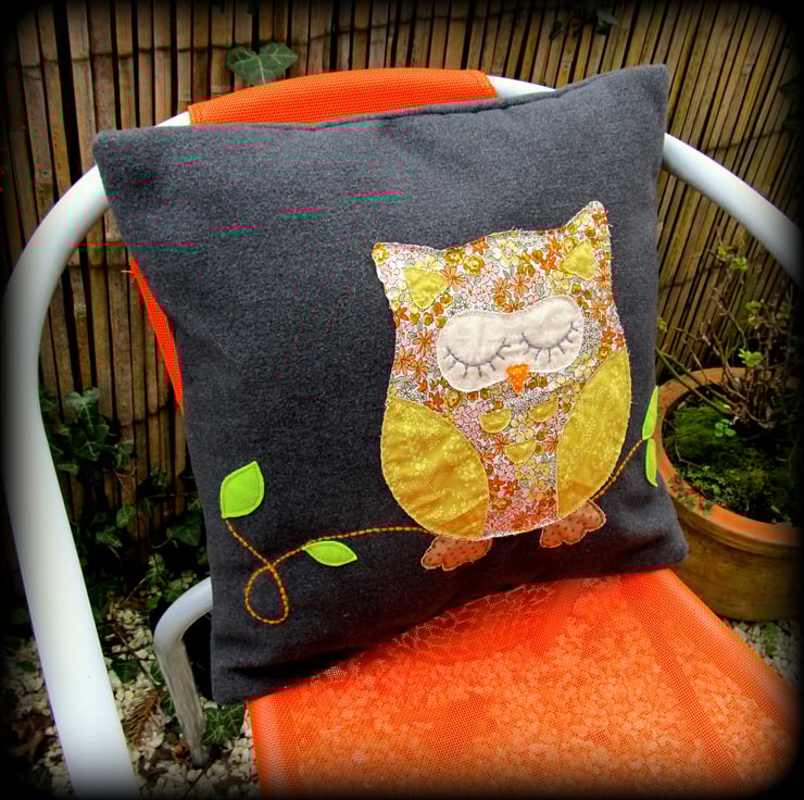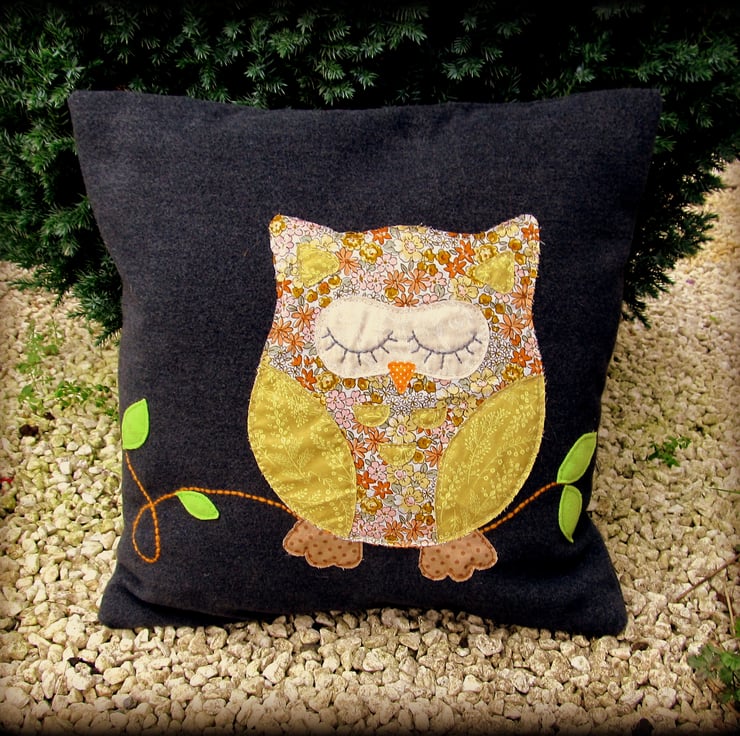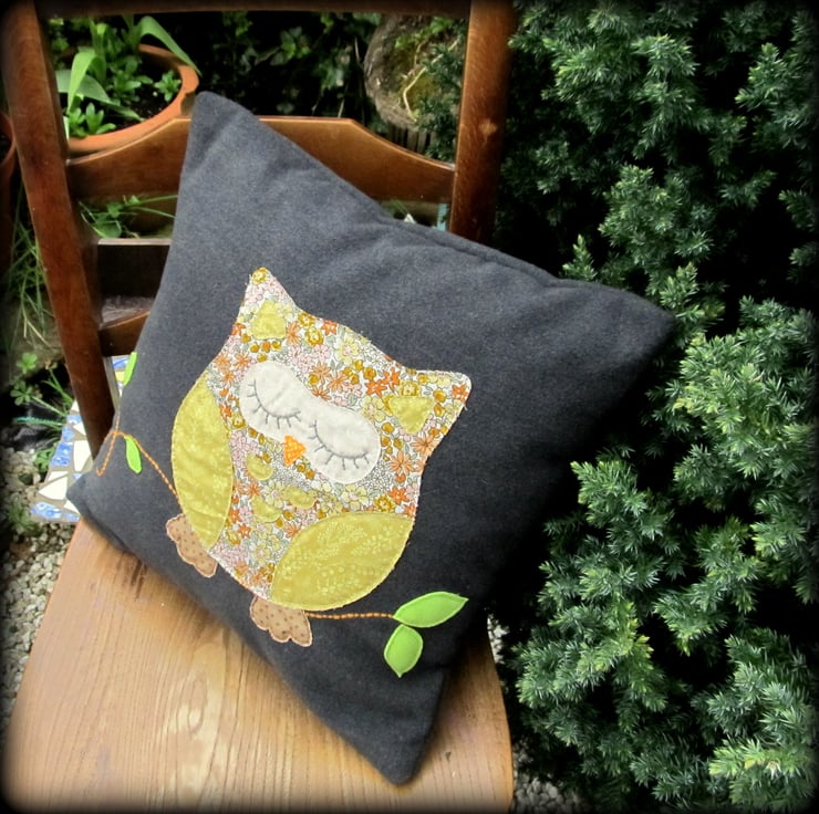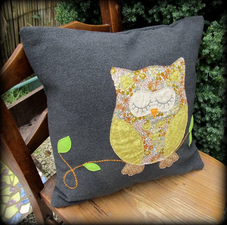 The snoozy owl has been hand appliqued onto a soft and tactile, woollen mix fabric.