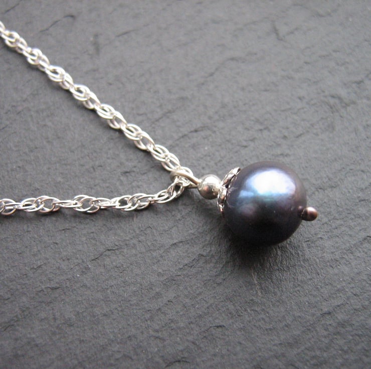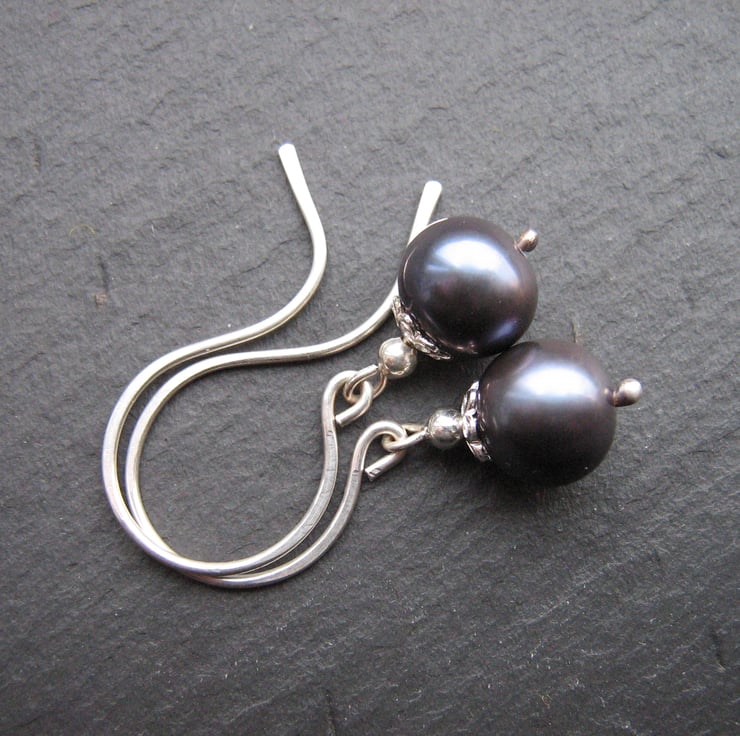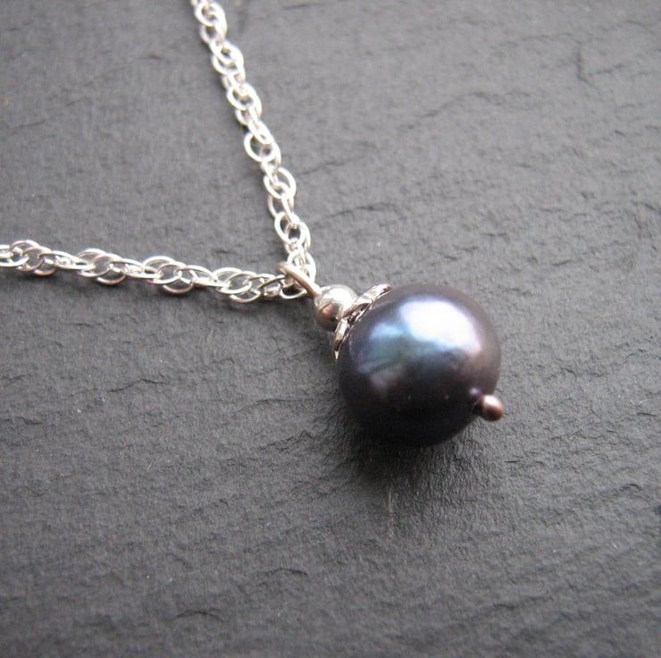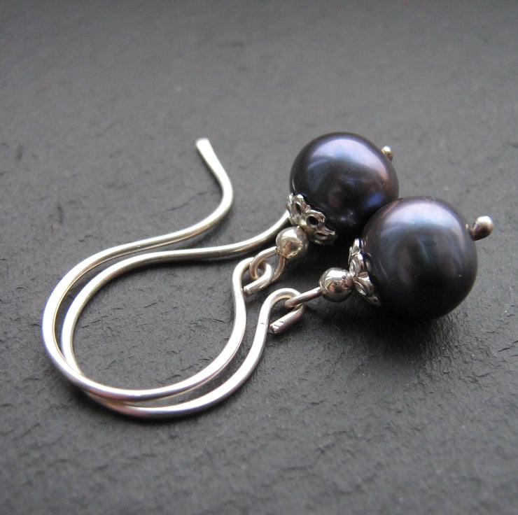 Three beautiful peacock freshwater pearls (8mm) couple with sterling silver to create this simple yet elegant pendant and earring jewellery set. The earrings have been handcrafted from 0.8mm sterling silver wire and hammered to shape and harden. The pendant hangs from a sterling silver chain, with your choice of 16 or 18" (please state preference upon purchase).