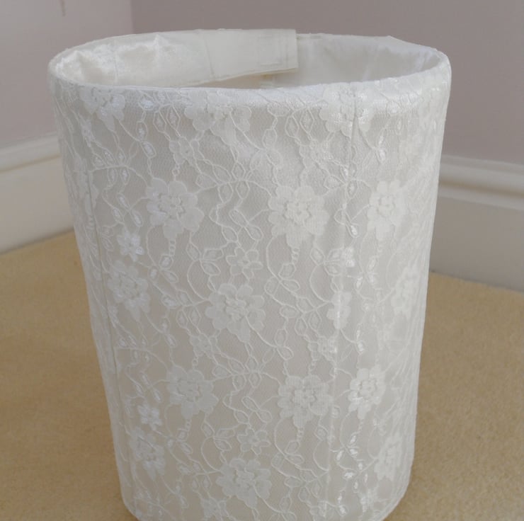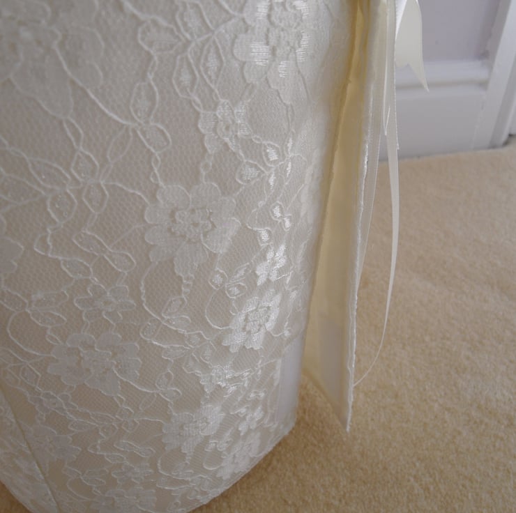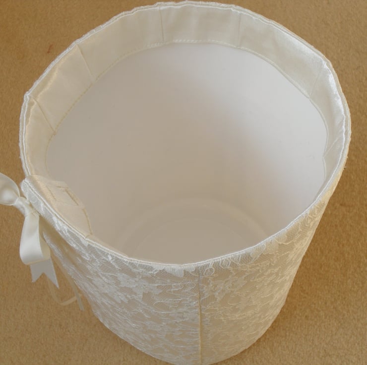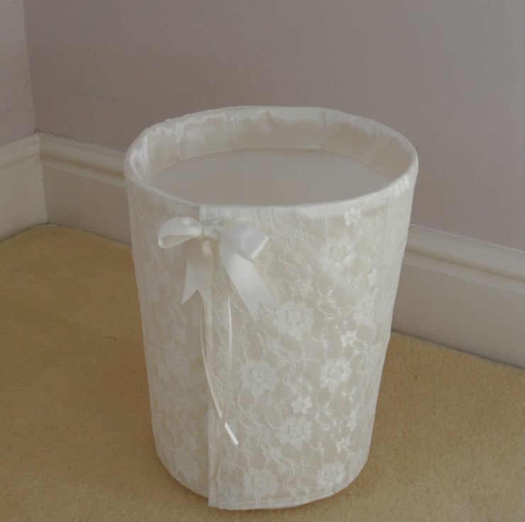 This lovely waste bin cover is made from lace, crepe and cotton fabric, It is suitable to be used for bathroom and bedroom's bins of which their sizes are diameter 7.5" height 9.5".