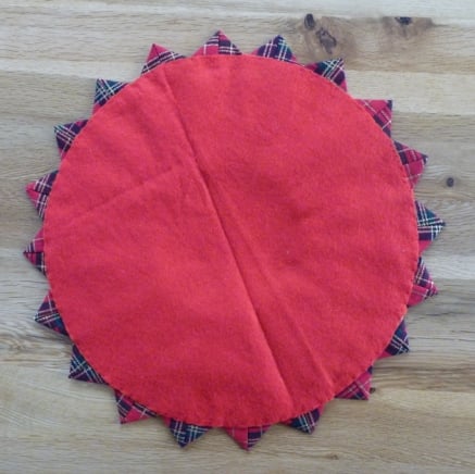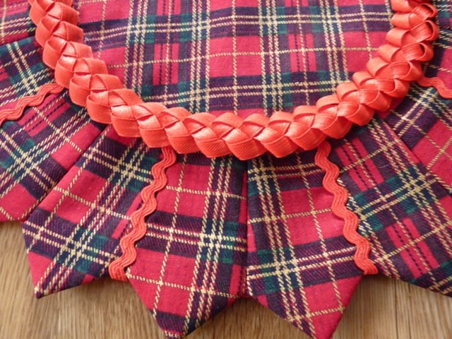 This lovely handmade Table Mat is made from a Red Tartan Fabric and Red Felt. I have also used a Red Ric Rac Brading on alternative sections. The satin ribbon around the center is all be woven by me to make this very affective pattern. I have hand sewn a round piece of Red Felt on the back to finish it of neatly. Its made up of 20 sections all sewn together to form this lovely mat which can be used in the center of a coffee table or dining table.