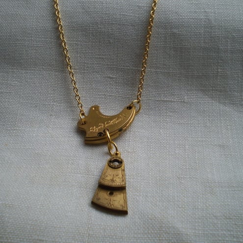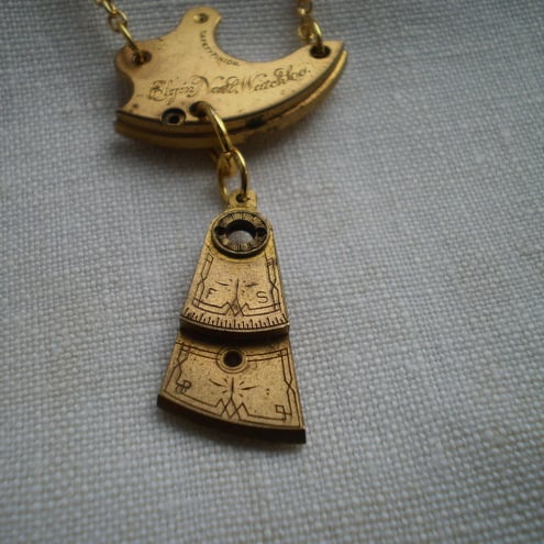 Two wonderful pieces from an antique pocket watch signed by Elgin have been used to make this unusual necklace. Lovely ornate etching and script make this piece something out of the ordinary. Hung from a goldtone 18 inch chain
