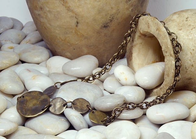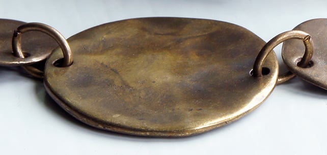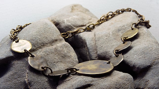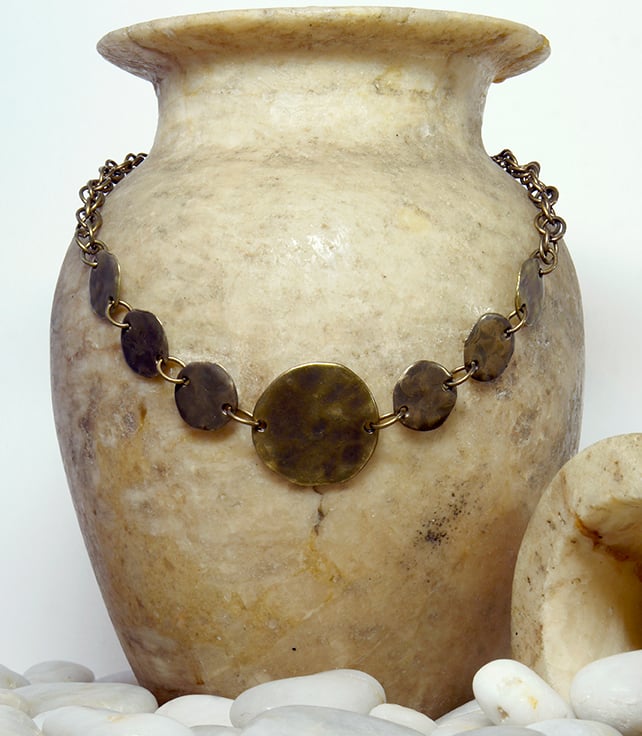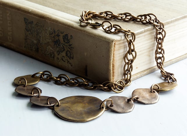 A simple statement piece of casual jewellery with an antique feel. The bronze coloured chain links seven discs to create an easy to wear distinctive necklace.