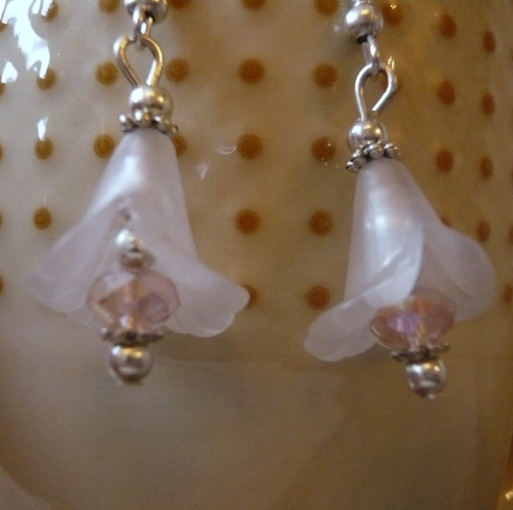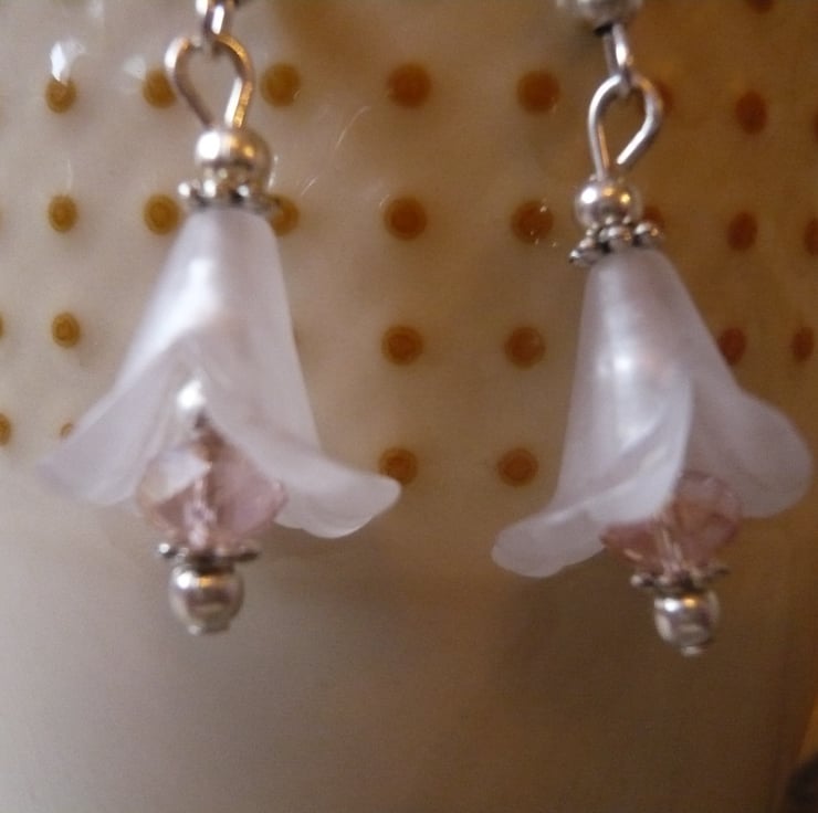 SALE Now £3.00. These pretty earrings are made from a white acrylic flower bead which encases a pale pink glass faceted bead. Very feminine and would look great accompanying any wedding outfit