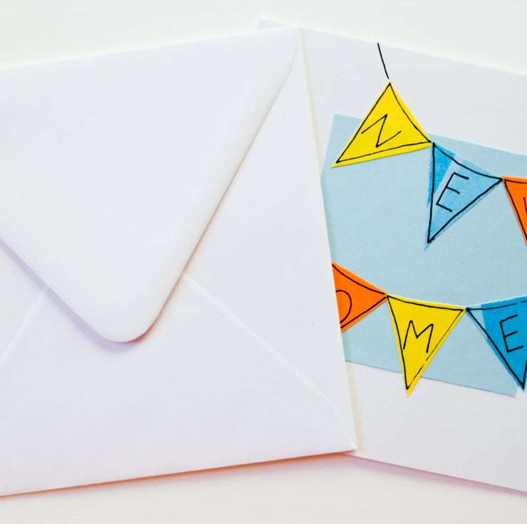 Each "Bunting" flag is hand cut and they are then individually attached on top of the background. Then mounted to the card giving it a textured and slightly 'raised' appearance.I then draw around the flags and hand write the greeting.