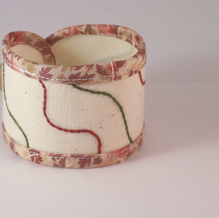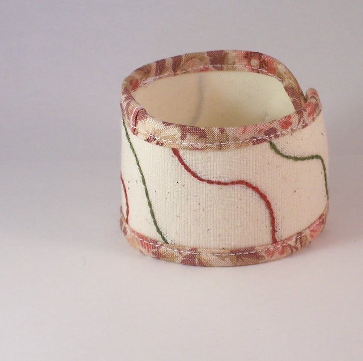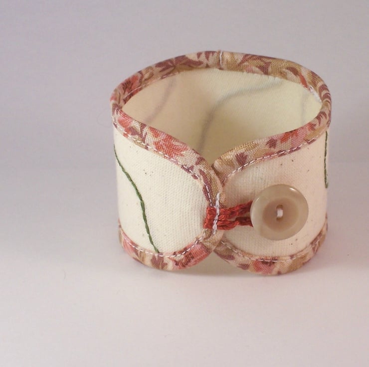 Lay Lines cuff in cream muslin, hand embroidered and lined. Edged with made to measure bias binding and finished with a crochet loop and vintage button in co-ordinating colours.