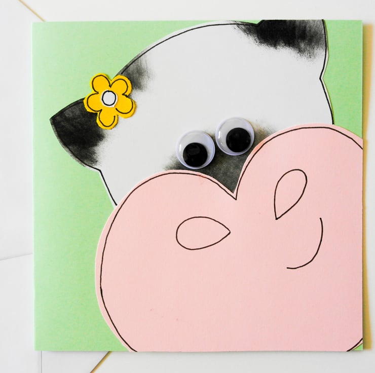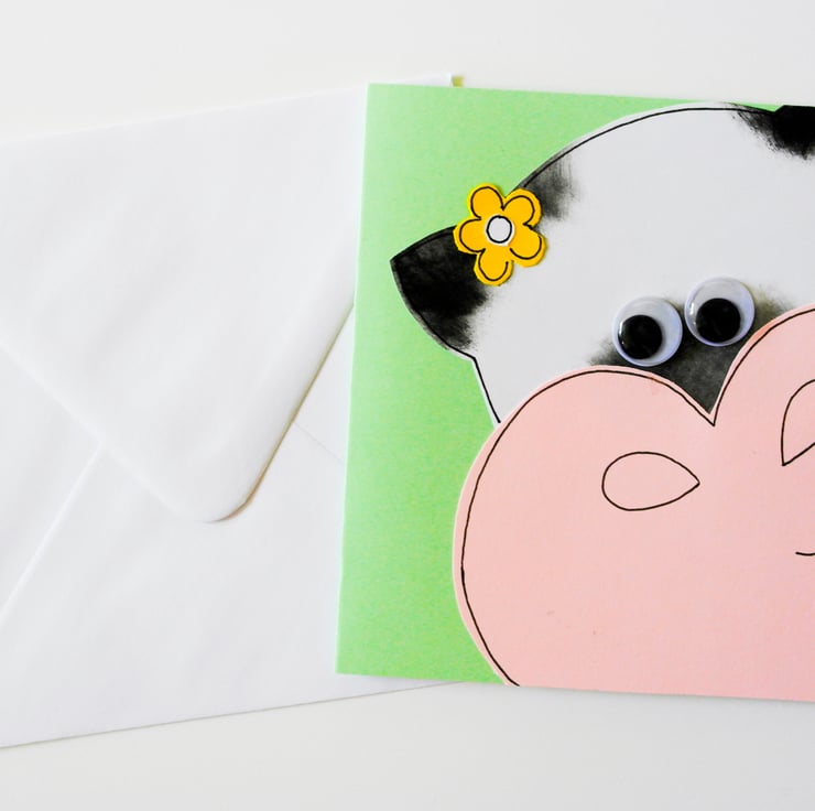 A cute handmade Daisy the cow card. A cute greeting card suitable for a birthday or any other occasion. Great for a child or any animal lover.
