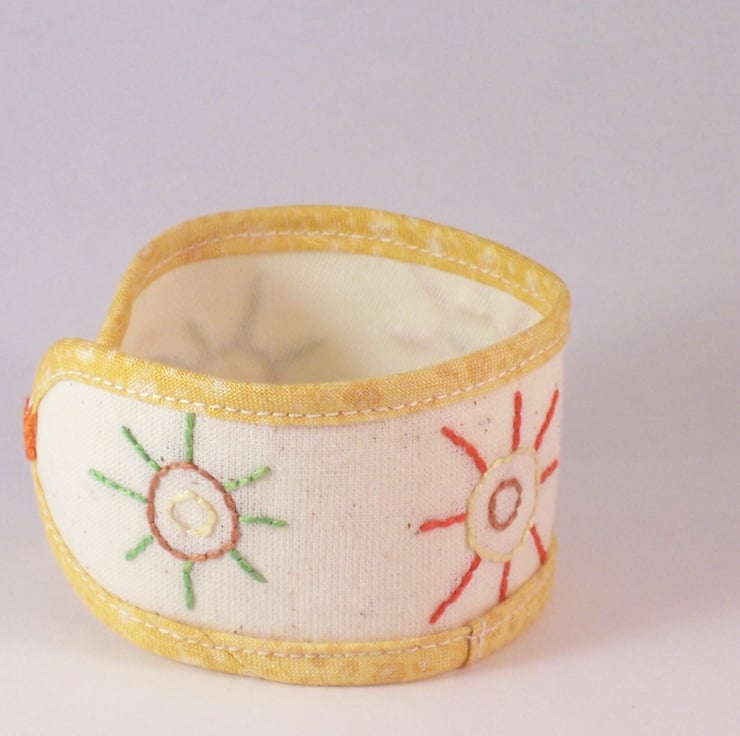 Sunbeam Cuff in cream muslin, hand embroidered and lined. Edged with made to measure bias binding and finished with a crochet loop and vintage button in co-ordinating colours.