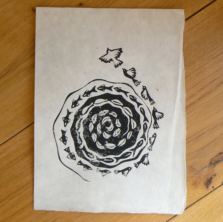This linocut is the second to be inspired by a dream I had. I kept accidentally feeding the goldfish bird seed, until one day it flew out of the bowl and straight out of the window.