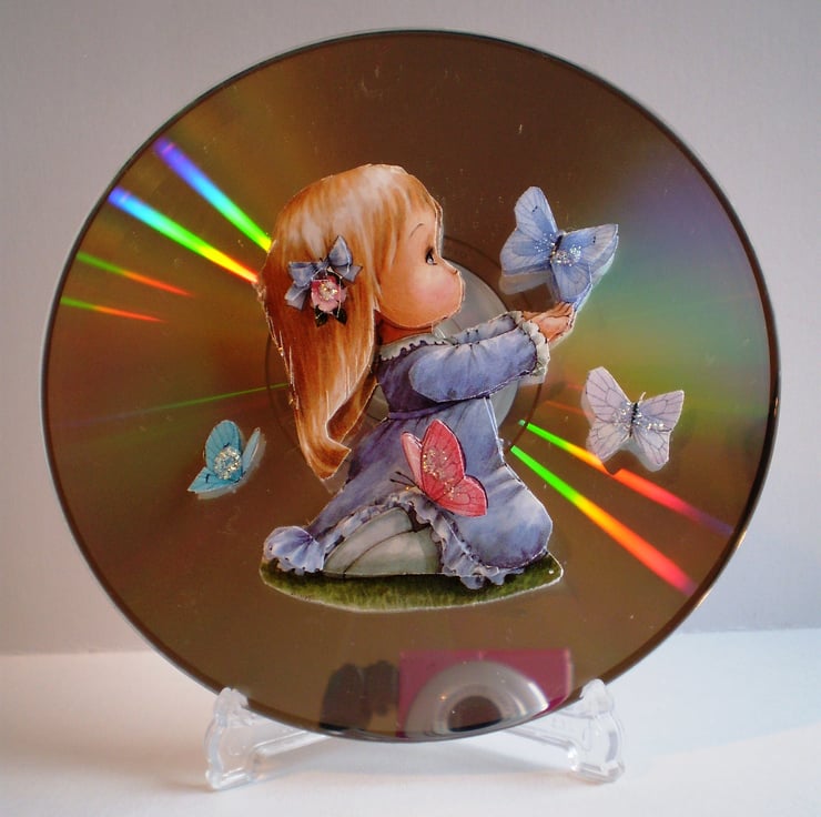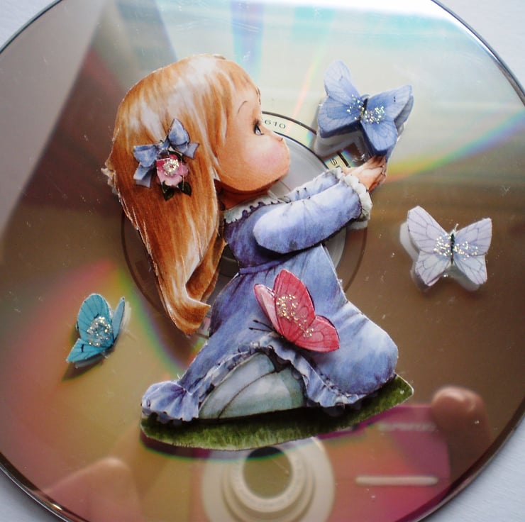 This is a cd with a decoupage /3Deffect cute girl with butterflies. It would suit a younger person and would look good on a wall or door using bluetack or stickyback fixers or on the small clear display stand shown in picture. To make it a little bit special I can put a name or any other greeting on it using peeloff stickers. The teddy bear picture is an example.