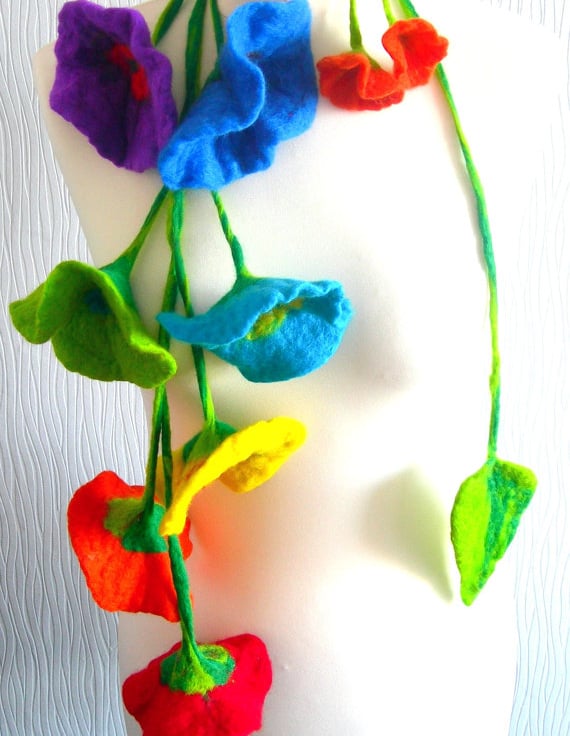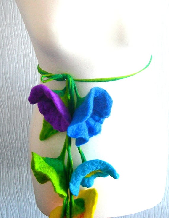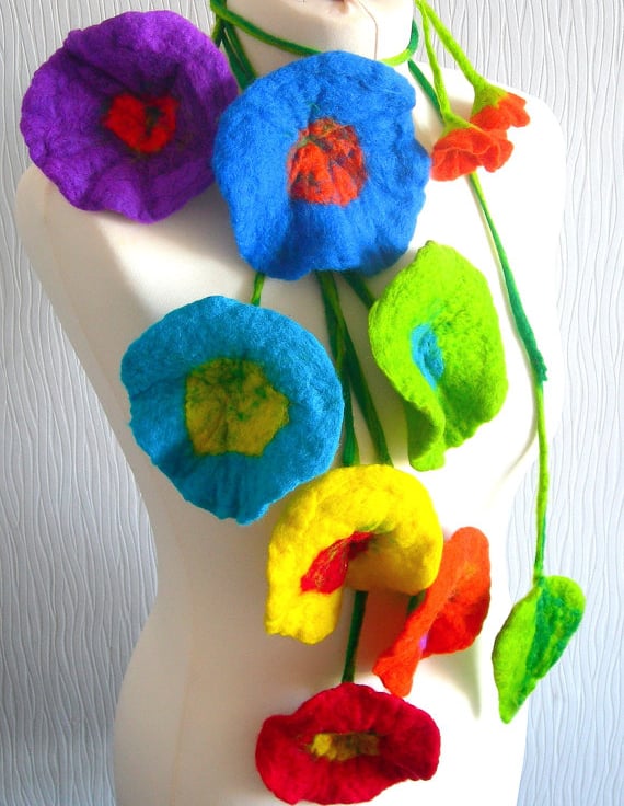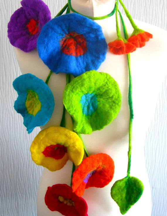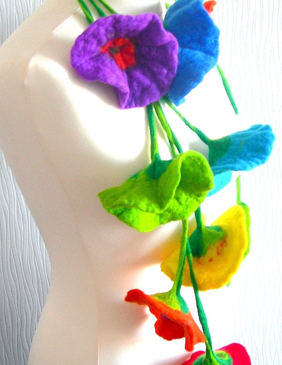 Hand Felted, Wool Jewelry scarf necklace-100% WOOL MERINO"FLY TO THE RAINBOW"