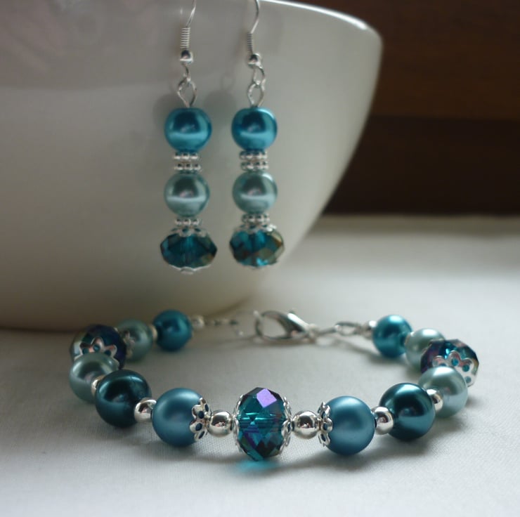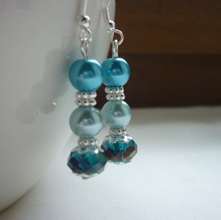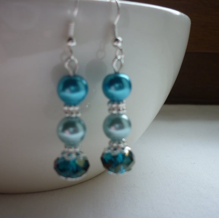 THE EARRINGS HAVE BEEN MADE WITH 8MM GLASS PEARLS IN SHADES OF TEAL, AQUA AND TURQUOISE ALONG WITH FACETED GLASS RONDELLE BEADS IN TEAL WITH MULTI LUSTER, SILVER PLATED DAISY SPACER BEADS, SILVER PLATED BEAD CAPS AND FINSIHED WITH SILVER PLATED KNICKLE FREE EAR WIRES.