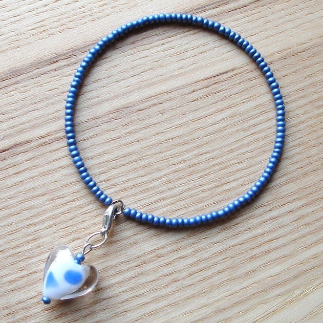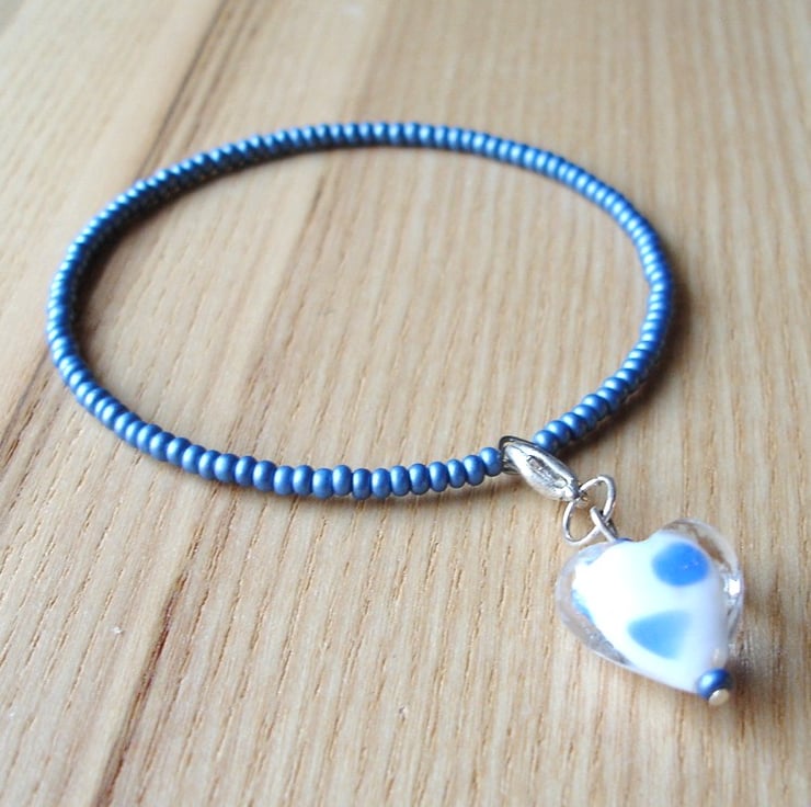 This gorgeous beaded bracelet is very kitsch. Strung on a loop of steel memory wire, it incorporates lots of pretty matte blue glass seed beads. The bracelet fastens with a spotty blue glass heart beaded charm. Wear the bracelet with or without the charm, or add the charm to another piece of jewellery for multiple looks. Length is 7.5 inches.
