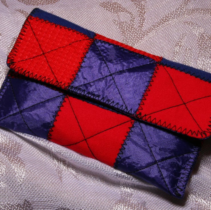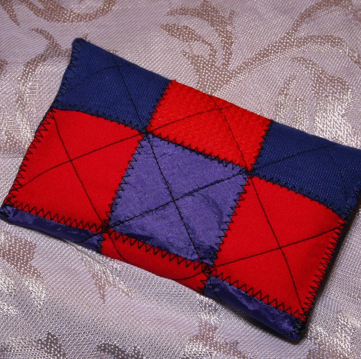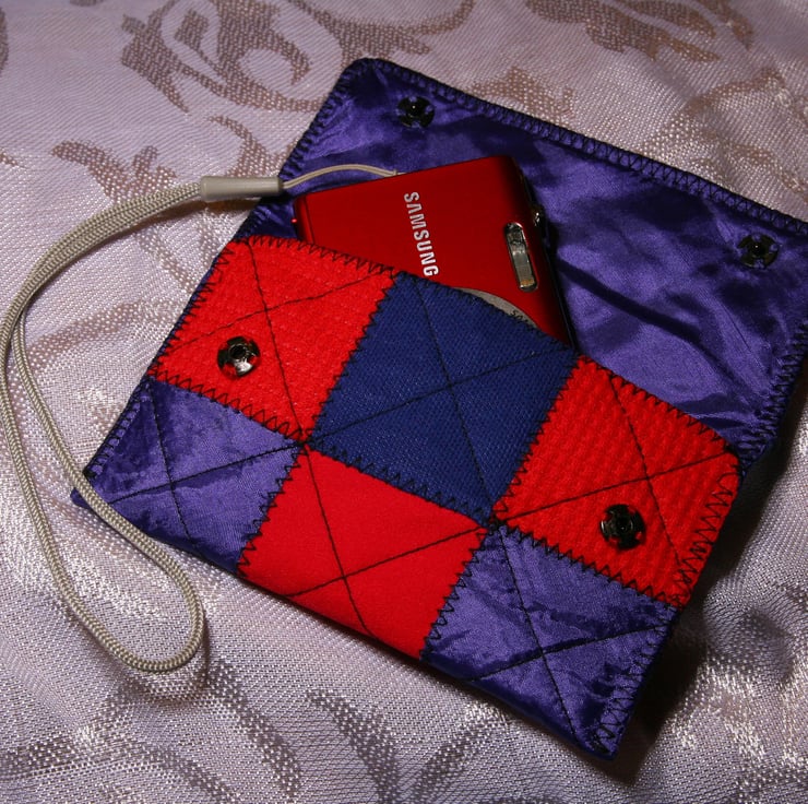 This eye catching, quilted, patchwork phone or camera case is hand made by me. It is a one off and would be unique to you. It measures 13cm x 8cm and has two popper fastenings. It is made from a variety of fabrics in shades of blue, purple and red giving an interesting contrast of colours and textures. It is lined with purple china silk, lightly padded and interfaced. (Phone and camera for display only and not included.)
