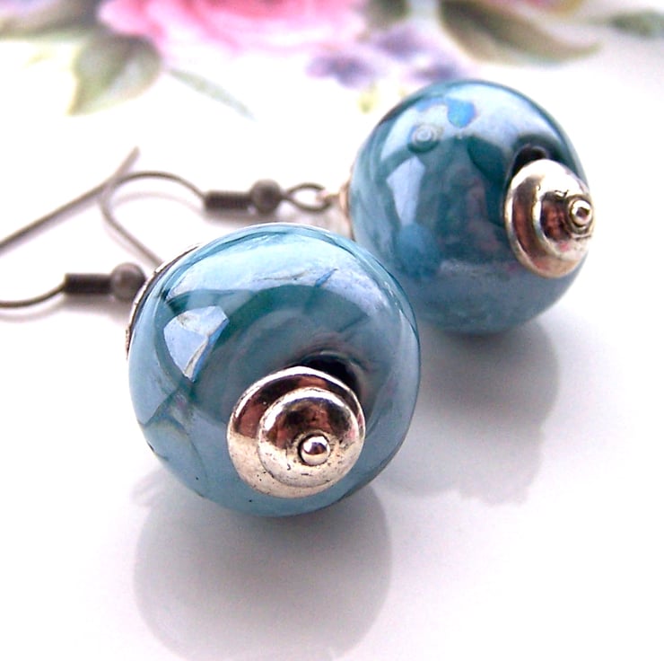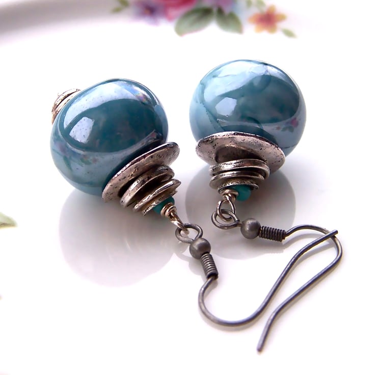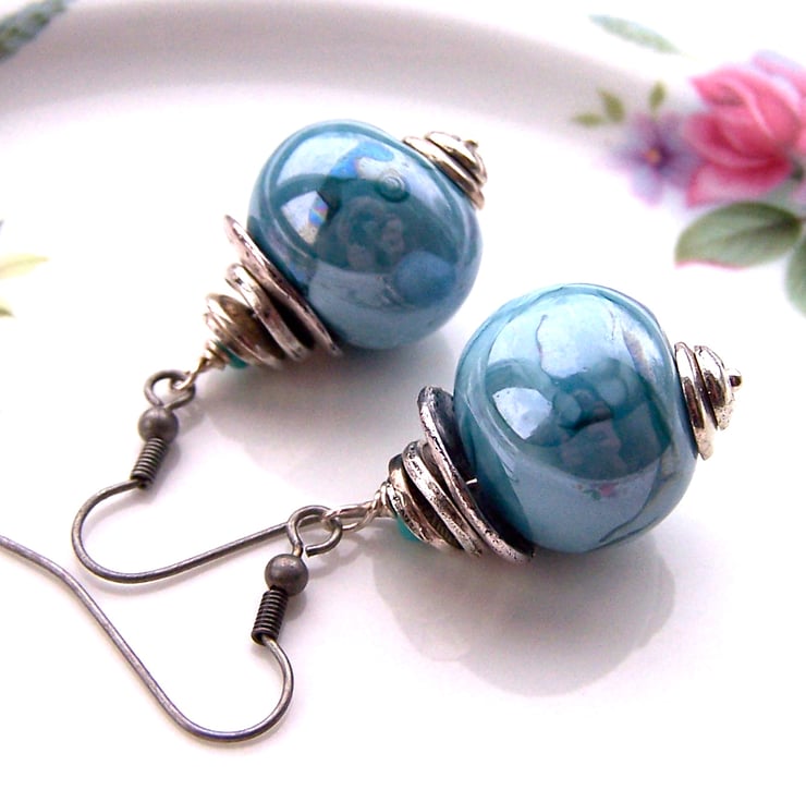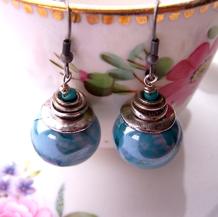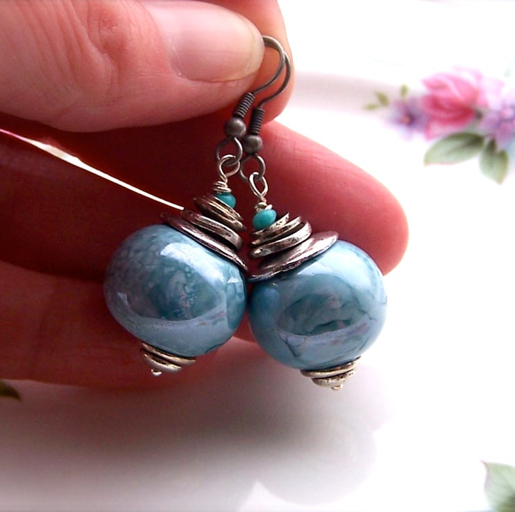 These earrings feature large ceramic beads in a lovely glossy shade of pale blue, not quite turquoise, and have a lovely marbled enamel finish.