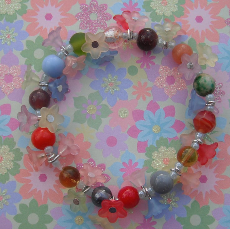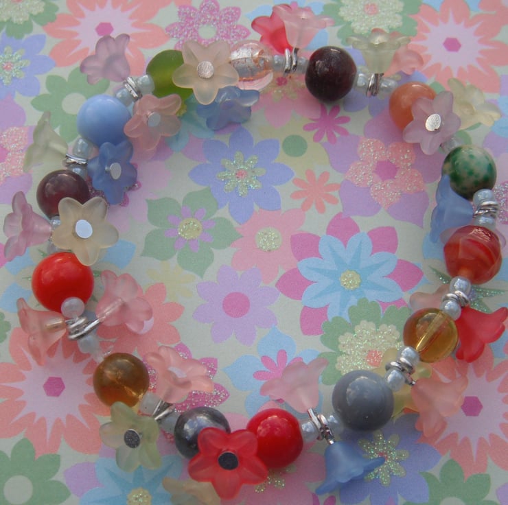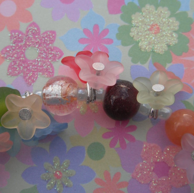 Made using different coloured lucite flower beads with different coloured round glass beads inbetween.